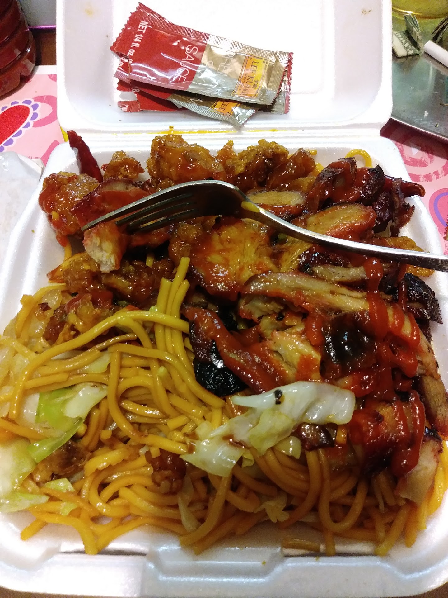 Read moreLets do a proper review here . First off I will admit I like the 2 plate sizes regular or huge but for me the regular 2 item combo was enough since they do fill it up to the brim . Lady serving me was decent I'll admit no greeting upon entering just met with a stare. Once I started to order my wife got orange and spicy orange chicken I got teriyaki and black pepper chicken. Only chowmein for our plates again these things were packed got one drink since well I am with my wife I noticed there was a charge on refills different prices for different sizes makes sense why they charge idk lol some of the drinks were out. But wife and I sat down to eat . My chicken teriyaki was tough and dry very unpleasant texture and no flavor what so ever and but black pepper chicken was way to sweet almost like orange chicken which I will be honest I am not a fan of . Noodles tho were the worst beyond comprehension they were oily yet dry had a flavor I am unable to explain. For my wife the orange chicken was chewy and hard all in one and the spicy one tasted burned to her the noodles for were the same to her and she aswell could not tell the flavor and made her sick 🤢. So tbh this place needs a shoot ton of work but my hopes is that they get better at it I will be trying it again in a couple months because I always have hopes places will get better both food and service wise. I really do hope they enjoy what they do if not why even own...