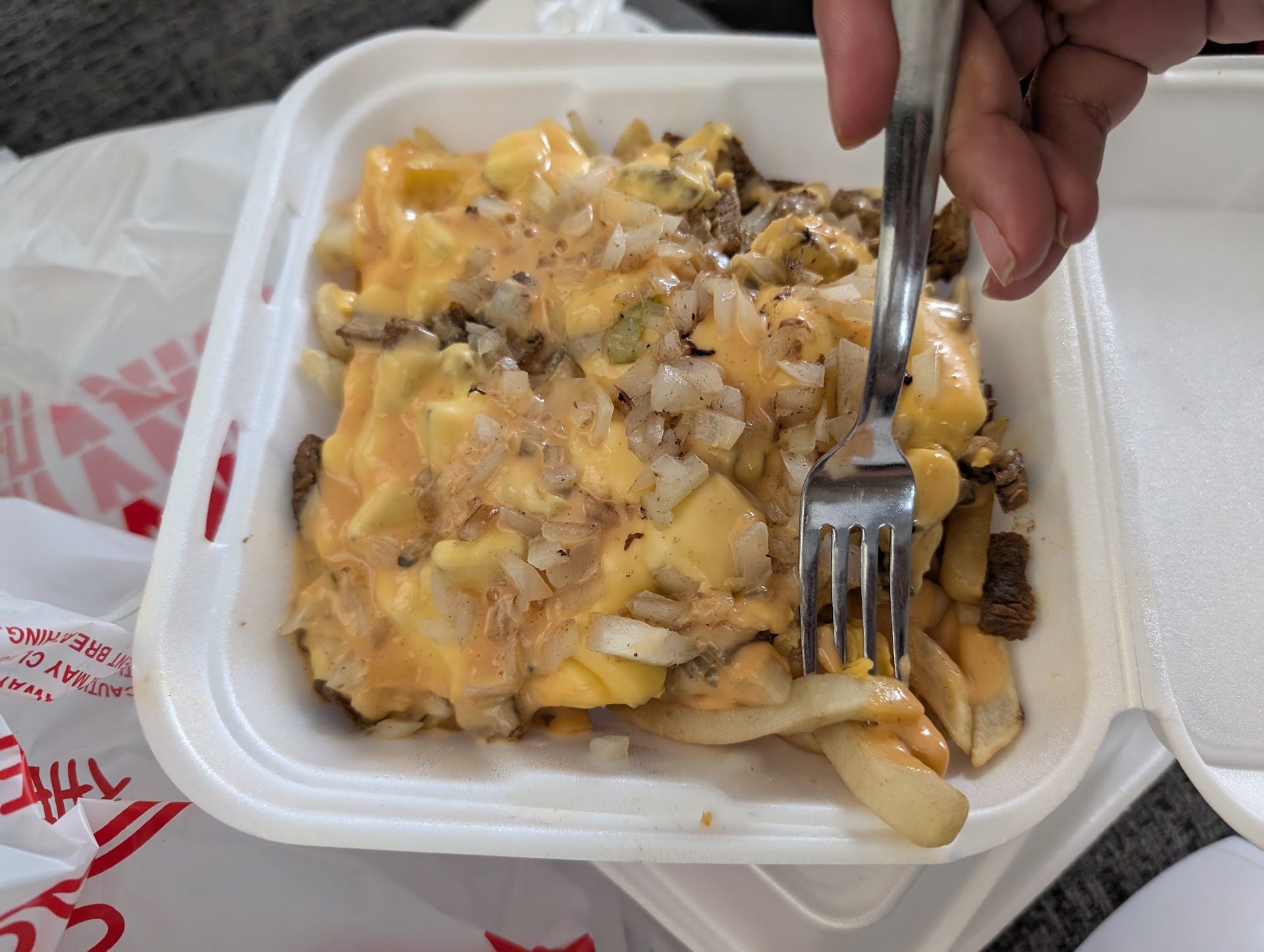 Came here to try this restaurant with my cousin. Arrived at the establishment at 10pm. Upon walking in we were not greeted with an appropriate welcoming; instead we were greeted with there is no dine in and only take out. There was a couple dining in when we arrived; the sign on the door and online stated they closed at 2am. We decided we would do takeout due to that being our only option for food. We had traveled 30 minutes due to the ravishing Google reviews. Once we received are order which came out extremely quick; decided to eat in the car since dining in wasn’t an option for us.