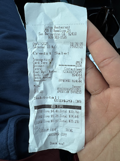 Read moreLotus restaurant it is an excellent place for food if you feel like your life has no more meaning and for some reason you end up in this part of the city which is in San Bernardino California and you want to eat some real good food you can stop by this place and you will have the best food that your taste buds will thank you it is a great place to eat it is in a great City which is San Bernardino I love San Bernardino you can stop by these awesome restaurants it's a little place but the kindness of these people it's amazing they will treat you like a king and their food is awesome it is in a part of the city which is a little bit sketchy but if you love danger and like I said if you don't care about your life anymore but would like to go out in a bomb but eating the right food you should stop by lotus restaurant it is one of the great masterpieces of the city of San Bernardino California of the US...