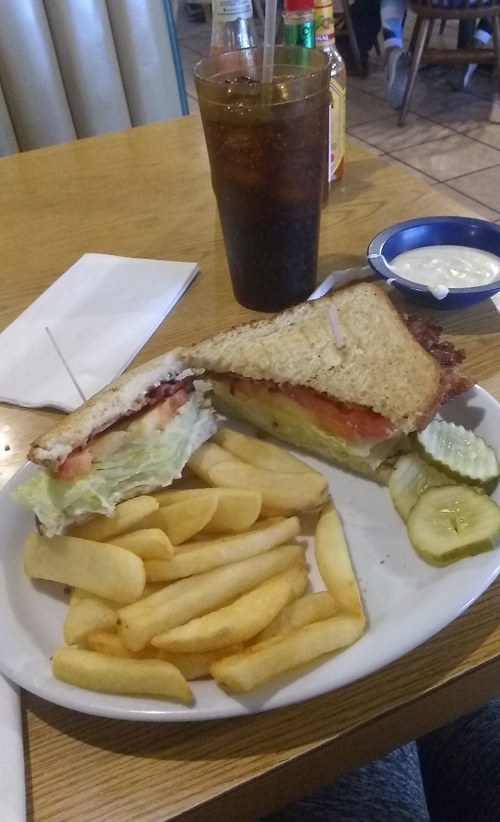 I had the classic club sandwich with fries and an iced tea — crispy, fresh, and perfectly satisfying. Moses went sweet with the French toast special and coffee, and he didn’t say much while eating… which says everything.