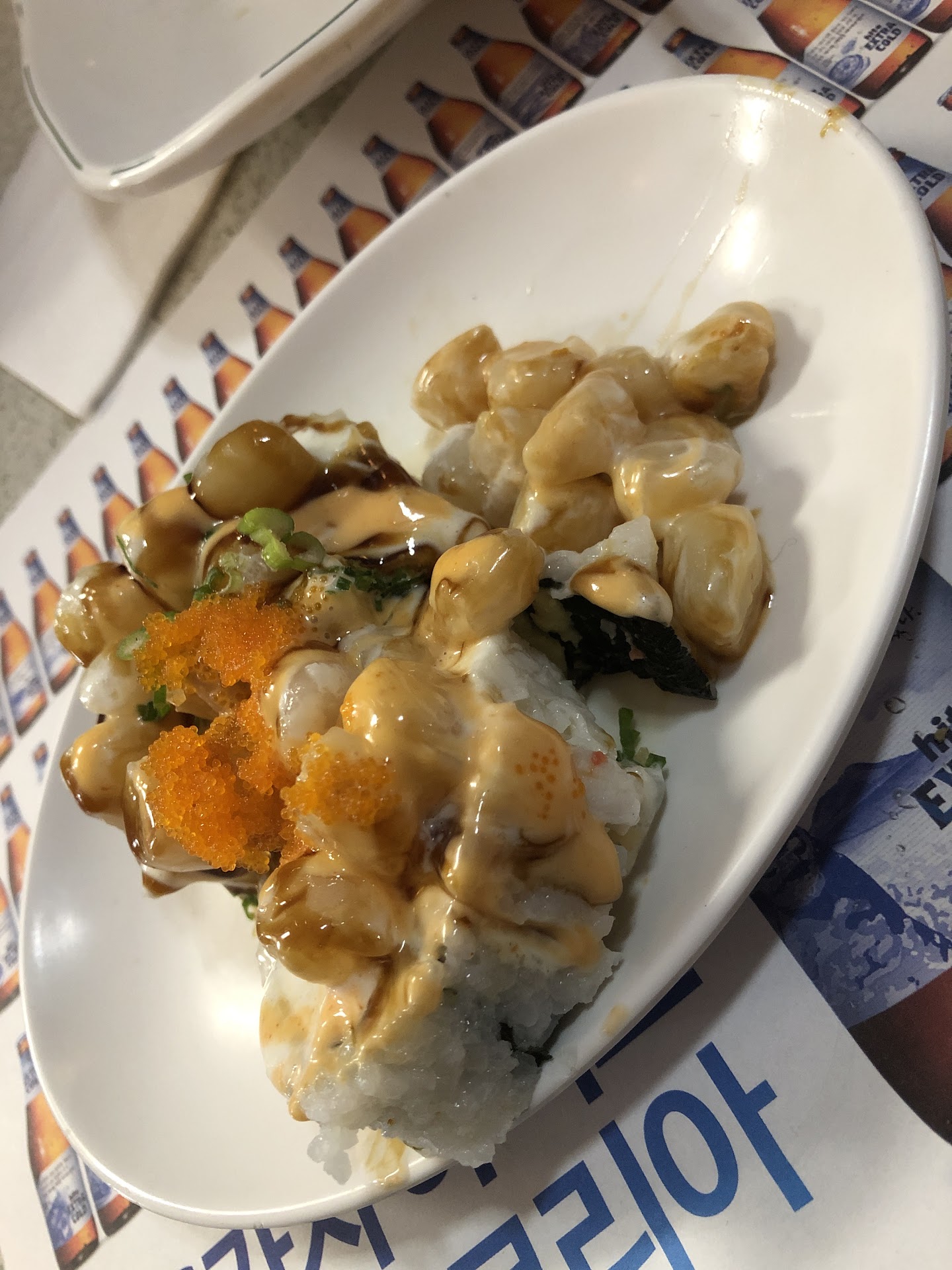 I order spicy ramen and a crunch roll, and my lady ordered a "volcano roll", which is the dynamite roll in most places, but their dynamite roll is different.