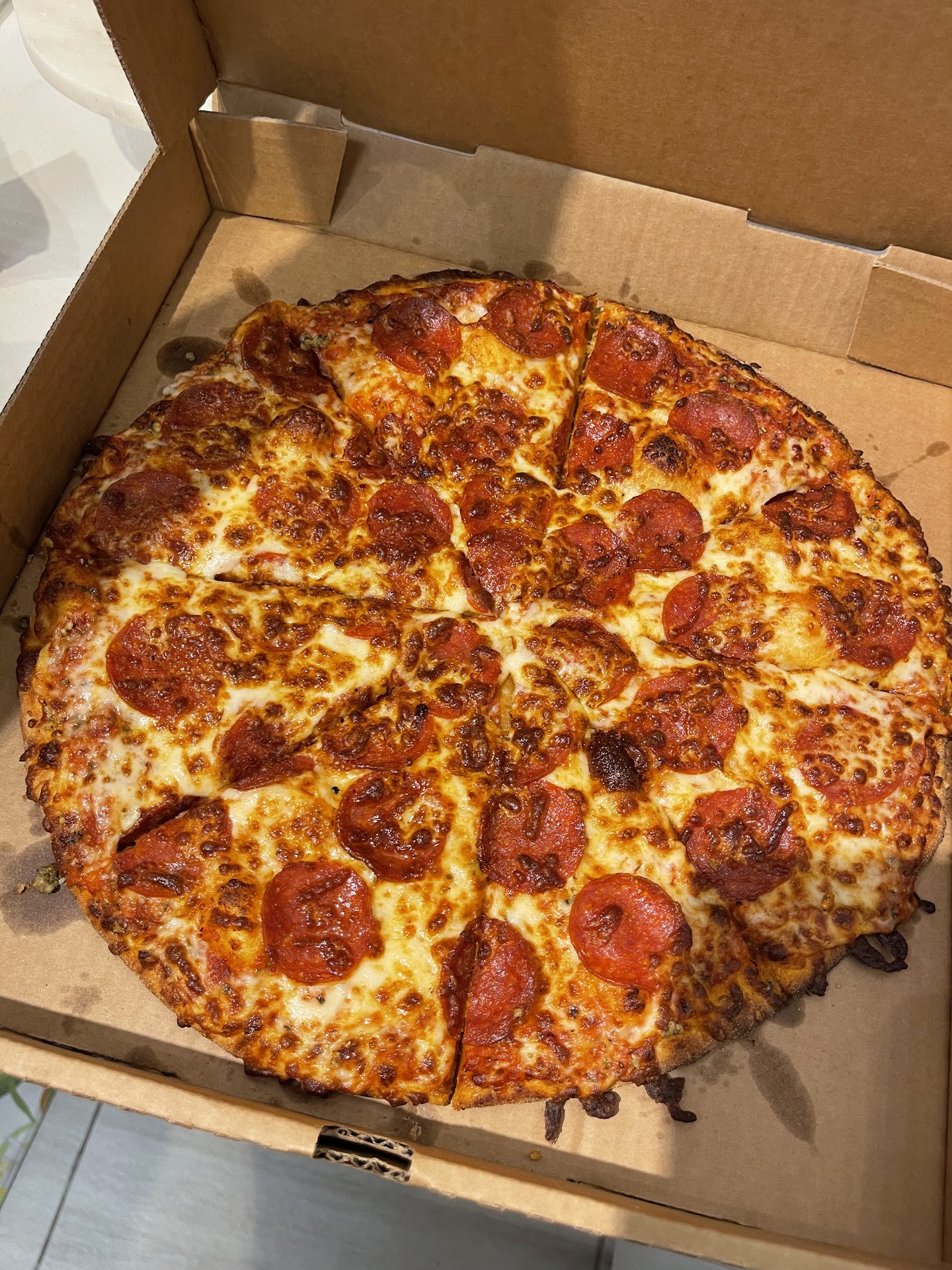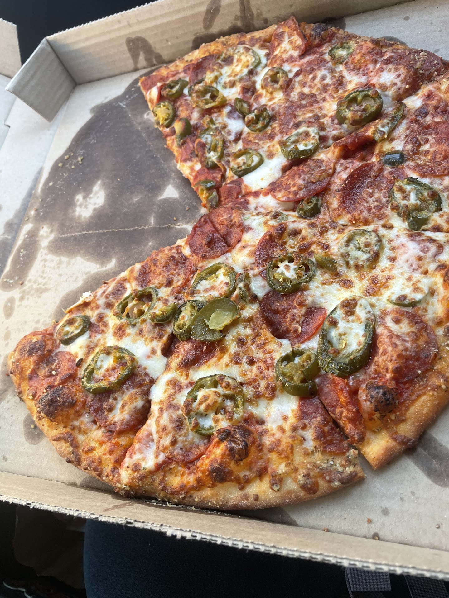 Read moreThe pizza box is a little greasy as the pictures show but that is normal for most pizza places these days. The pizza itself is not very greasy. It is not very thick but that’s a good thing. The bread is very soft, even after you microwave it. The toppings are good they provide a fair amount. The cheese is good it does not fall off in chunks as some pizzas do.