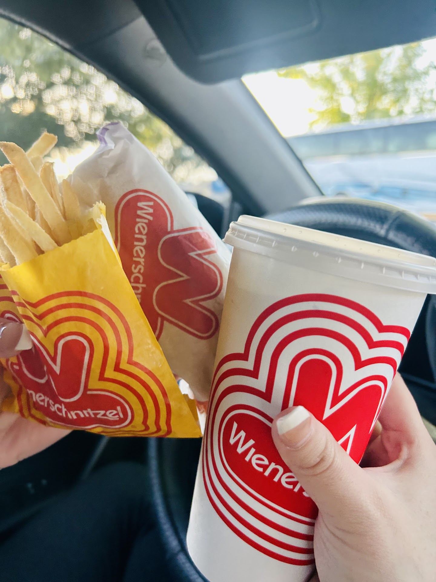 I needed the bathroom. My doggie was sick and I was very stressed about it. Think I was crying when I walked in. All I can say is that I felt no judgement whatsoever. The staff sensed I was not doing good, because I was inwardly really scared my dog was going to die. I ordered him and a hot dog. Then I used the bathroom and left. Again, no judgement from anyone there. They asked me if I was okay. Always nice when restaurants have a heart. These days with everything being so toxic ( isn't that a Brittany spears song ? ) ... it's comforting to know that when places are loving and king, it makes up for the non organic vibes. On that note it would be good for Weinerschnitzel to consider an organic dog. Anyway my puppy died because I forgot to give him a very important injection. Please make sure your dog is vaccinated for Parvo. It's very uncool and not good. Weinerschintzel on the other hand, very cool and super good. The hot dog was very simple and it did the job. Blessings and...