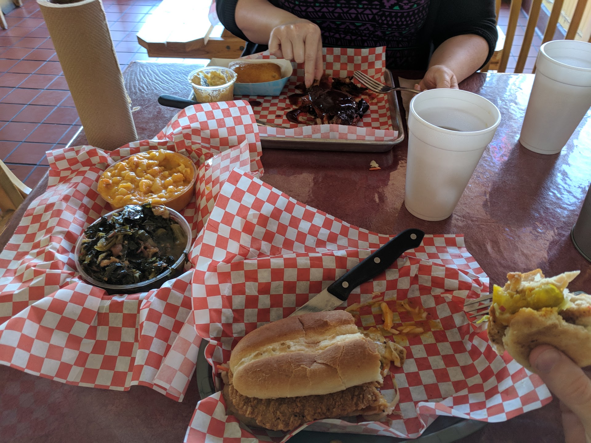 The meal in the picture was a fried chicken sandwich with coleslaw and a sweet sauce. Sides of crawfish mac n cheese, collard greens, and potato salad. Across the way is BBQ chicken with the top notch sauce. Peach tea all around and the best desert you can imagine after... Honey bourbon corn bread!