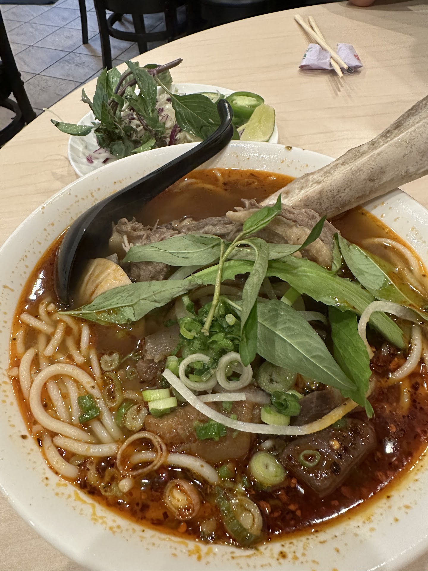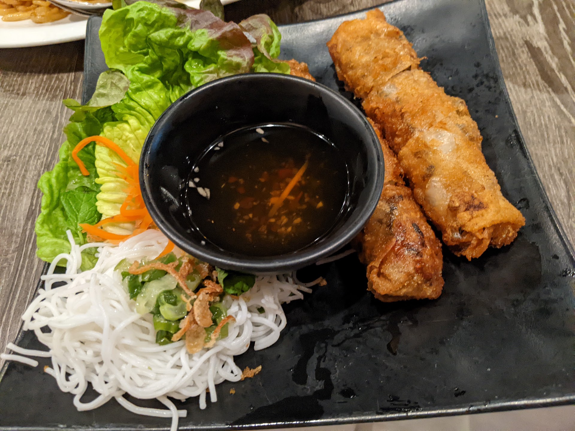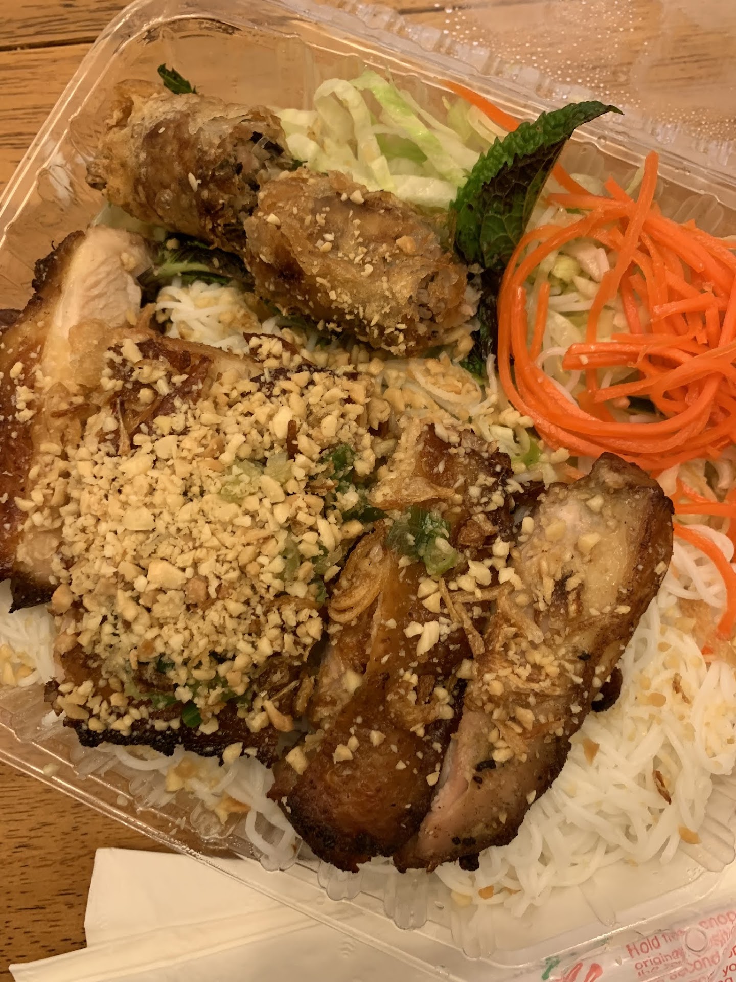 Read moreDecided to try this new vietnamese restaurant especially since they had bun rieu on their menu. Ordered the imperial rolls, pork chop with rice, 5 spice chicken with vermicelli, and large bun rieu to go(their take out menu numbers are different from their regular menu numbers, so don't get confused!). The food was ready in about 15 minutes. Inside was a lot bigger than the outside lets you think. Theres a good amount of tables and it is very clean inside. The food was well packaged and the large noodle soup was a generous portion. I was a little disappointed that the imperial rolls only came with 2 rolls, but they were pretty tasty. I liked that they put fried shallots with the noodles it came with. The vermicelli noodles did not come with fish sauce which we thought was a bit odd, but at least we had some from the other dishes. The pork chops were a bit small, but it did come with 3 pieces. The bun rieu came with fried tofu and crab/pork meatballs. The presentation of the meals were good but I think the meals lacked flavor overall. The noodles were a bit bland even though there was a strong crab smell. Even the vermicelli was quite bland. While I do hope to come again and eat in their restaurant, I wish their dishes had a bit...
