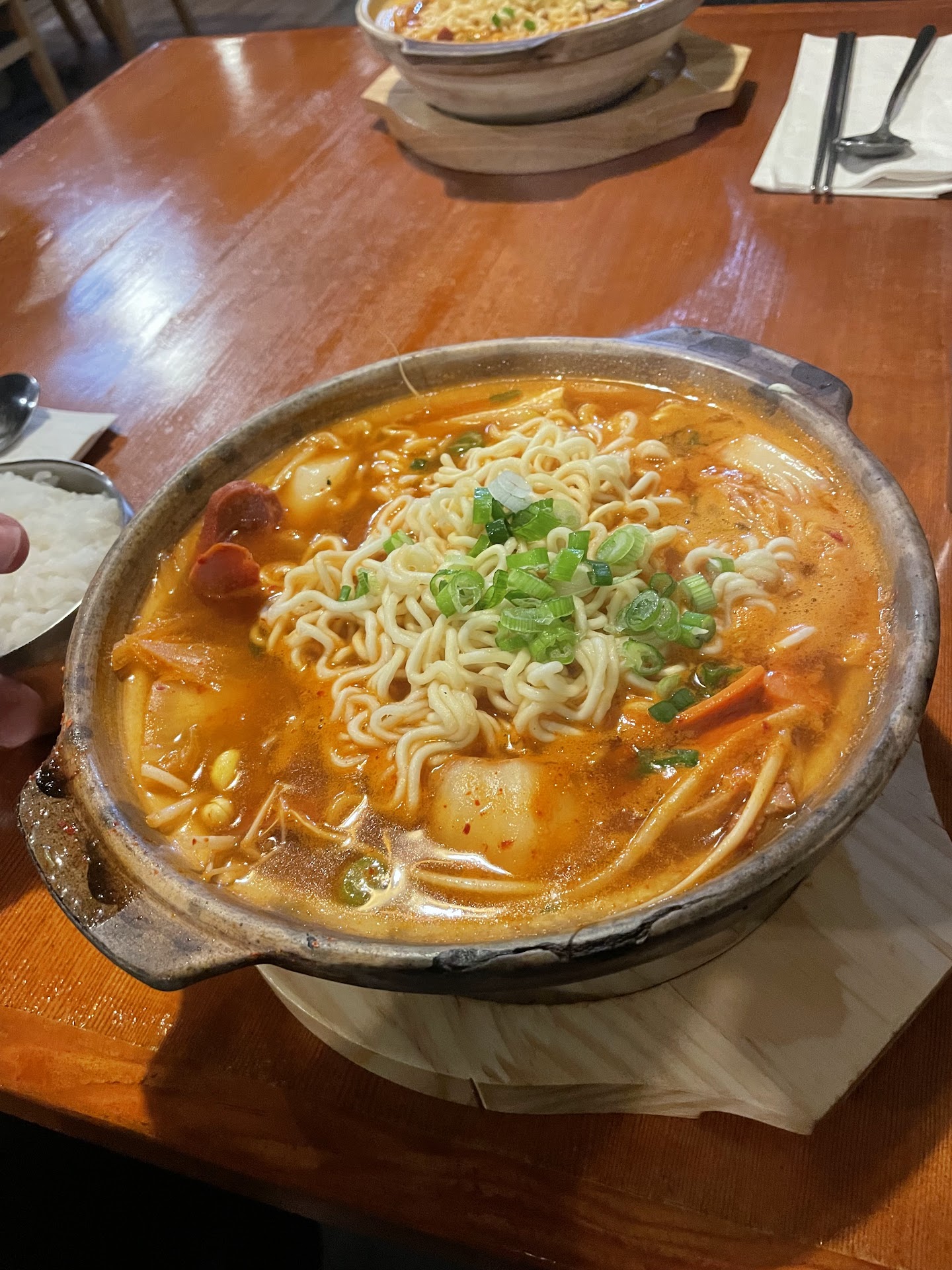 We ordered the beef stone bibimbap and the tteokguk soup (rice cake soup). The portions were huge. The bibimbap was sizzling as it was being served, as it should. The meat to vegetable ratio was generous and my tteokguk was also plentiful with rice cakes and broth. The broth was really tasty and I nearly drank the whole bowl. The soypaste stew was also delicious and the seafood pancake was had plenty of seafood in it and very tasty. Everything was really delicious and I would return for another meal.