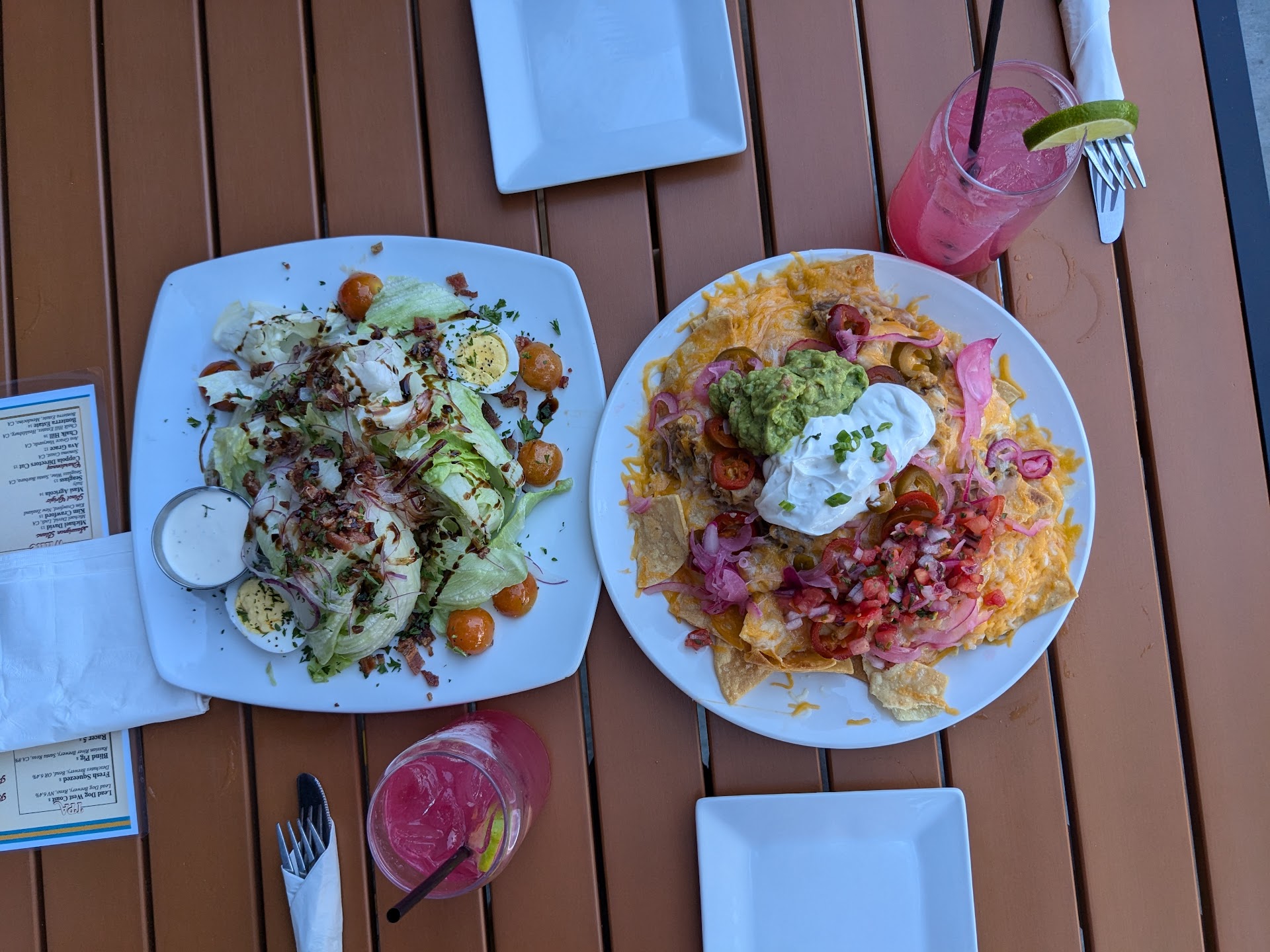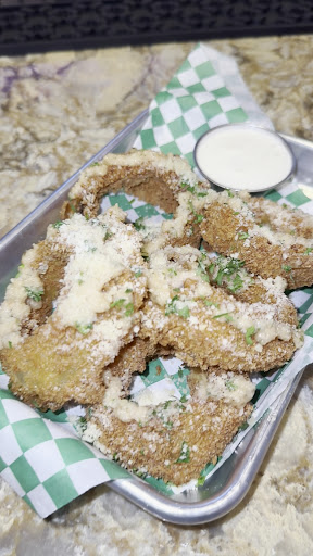 For food, I started with the garlic parmesan onion rings. While the presentation looked good, the taste fell short—overcooked, too much batter, and very little onion inside (4/10). For my entrée, I had the grilled fish tacos, which were decent but not great. The tortillas were overcooked and tough, and overall, they felt a bit overpriced for what you get (6/10).