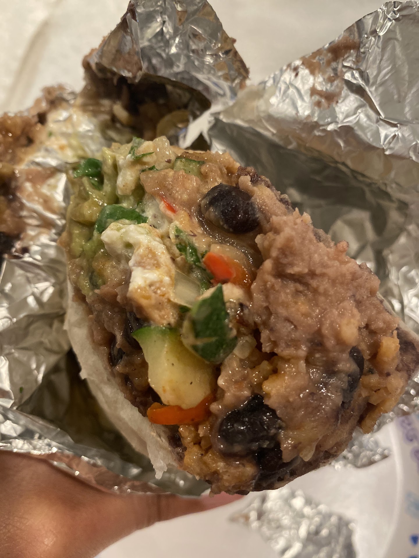 They use chicken broth to cook the rice so it is not vegan / veg friendly . The beans are vegan / vegetarian from what I was told.