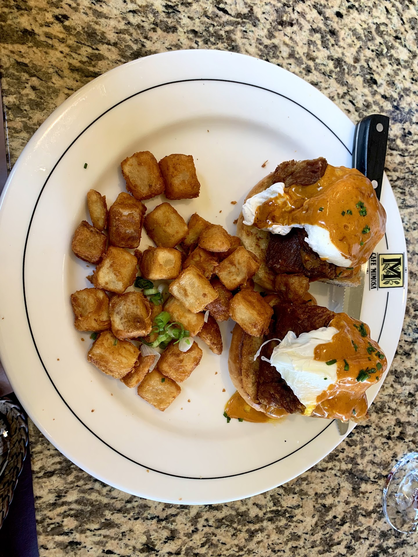 FABULOUS BREAKFAST ! We've been coming to San Clemente for quite a few years...as far back as 2010 to have breakfast at La Galette Creperie opposite the San Clemente Pier now sadly closed. And in more recent years Brussels Bistro, South of Nick's & Antoine's Cafe on El Camino Real. BUT THEN ! Finally after years of talking about it we moved into a beautiful townhome up in the hills of San Clemente in late 2024. Now that we actually lived here my wife suggested we should expand our horizons and try new dining spots. On a recent Sunday during our bike ride I stopped by here and asked to see the menu...a server / cashier named Ian even said they have a machine to make fresh squeezed orange juice. WOW ! I also saw an espresso machine. I was impressed with the breakfast menu, the fresh squeezed orange juice and Ian. The following Sunday we drove down here soon after 8am when they open. We ran into Ian the server again and he offered us seating on the heated outdoor patio. FIRST UP ! Glasses of cool water, a Fresh Squeezed Orange Juice and 2 x Cappuccinos with 2% milk and hazelnut syrup. This Ian guy was certainly on the ball....our frothy cappuccinos came out quick and tasted pretty decent. FOOD ! My wife ordered the Scramble Plate ( Scrambled eggs. Choice of ham, bacon or sausage. Served with house potatoes )...my wife asked for crispy bacon while I was chose Traditional Eggs Benedict ( Toasted brioche, smoked paprika, hollandaise, house potatoes )...with hard poached eggs. Meanwhile the outdoor patio was getting packed out quickly. Like I said our cappuccinos tasted pretty decent..very strong coffee underneath the froth. WHOO HOO ! Our breakfast dishes arrived faster than a speeding train and looked astounding. In fact we were a bit overawed by the beautiful presentation of our breakfast orders. TOTALLY DELICIOUS ! We loved our brekkie dishes...crispy bacon for my wife and perfect hard poached eggs for me. And the smoked paprika hollandaise sauce tasted killer good. YEAH BABY ! My fresh squeezed orange juice tasted good to last drop. We had already agreed that a return visit was a must when a guy with a big moustache and a baseball cap on top planted himself in a chair at our table. It was Antoine the colorful owner...a French guy who has lived in San Clemente most of his life. In fact his Mom runs Antoine's Cafe on El Camino Real. We had a wonderful chat for a few minutes. Gee the flourless chocolate cake sounded good...excellent lunch menu. WE'LL BE...
