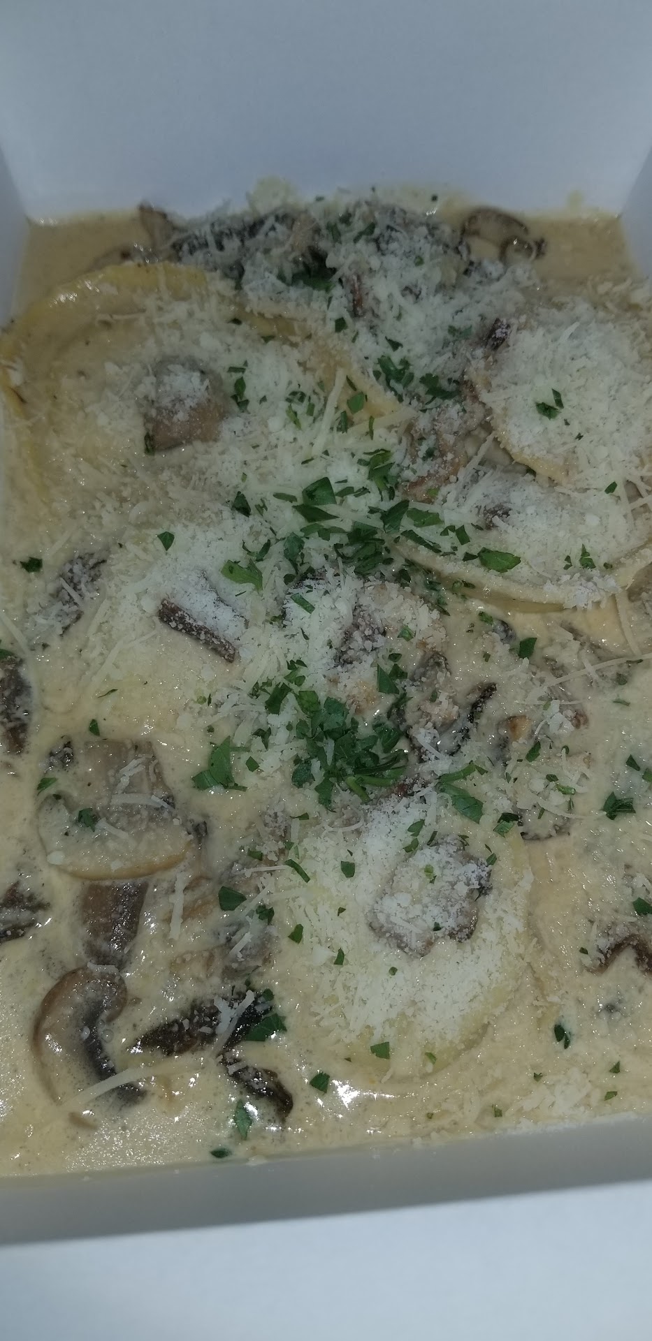 and either: JUMBO RICOTTA CHEESE RAVIOLI jumbo ricotta stuffed ravioli, porcini & button mushrooms, light cream, sherry wine, garlic $9.95, let's call it $10 or PENNE w/ EGGPLANT eggplant, marinara sauce, white onions, mozzarella cheese 9.50, let's call it $10 or TORTELLINI spinach tortellini stuffed w/ cheese, prosciutto ham, mushrooms, peas, tomato cream sauce 9.95, let's call it $10