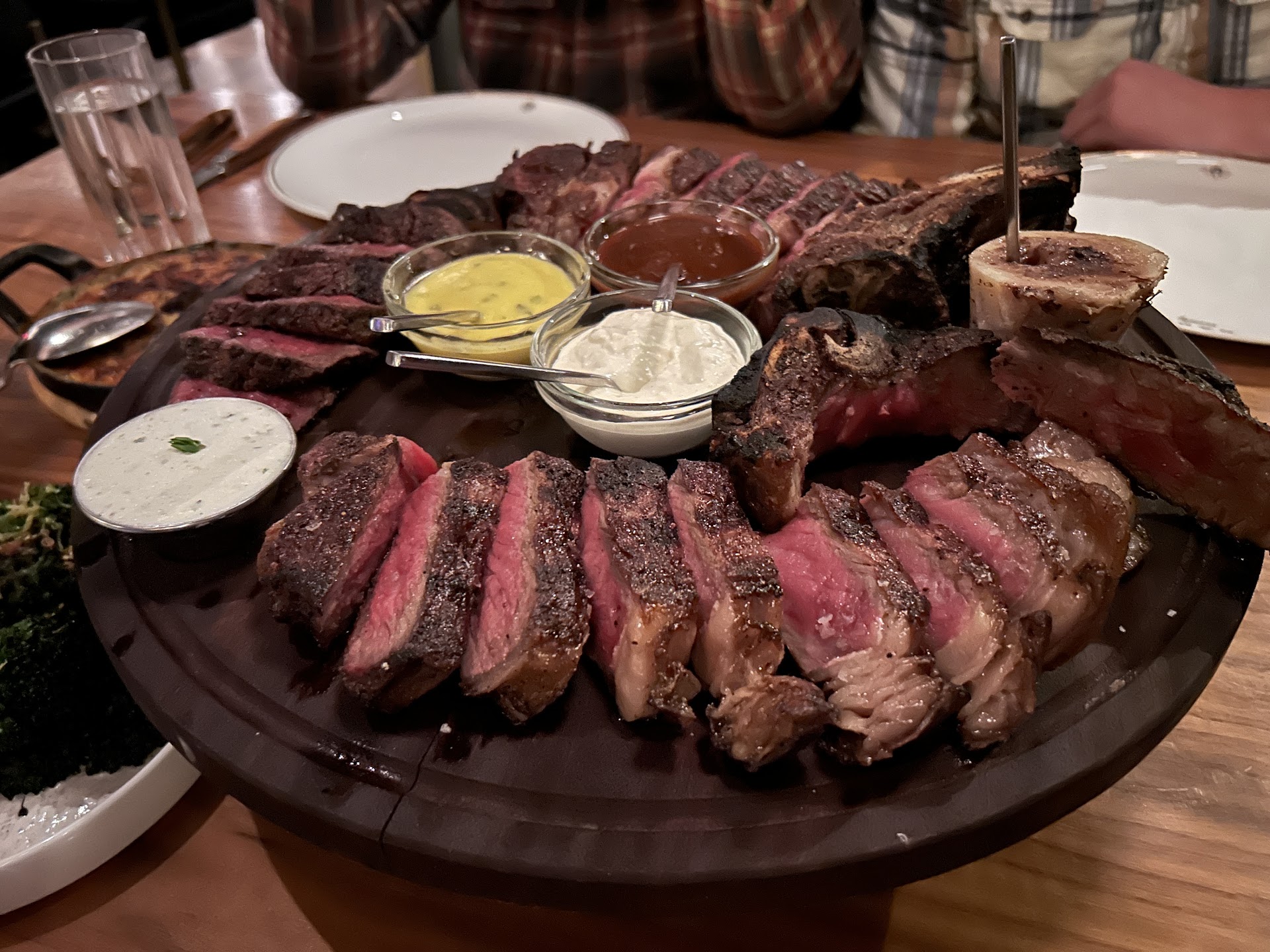 Ordered some appetizers and a meat board: appetizers were a little salty but still ok. The meat board took a while to come out. It looked like the table next to us, who was seated and ordered after us, got their meat board first. Probably not a good sign. They dropped off “warm” plates that don’t really do much if the steak arrives 20 minutes later and the plates are now cold. Meat board comes out and the steak is cold. Not room temp, just cold. When we mentioned this, they said the meat needs to rest 10 minutes before serving. I get that and why it is necessary, but shouldn’t it be resting while being kept warm? I’ve never had a steak served that cold. It was a huge disappointment because now we just needed to wait longer to have it warmed up. When it came back out, it didn’t seem like the whole board was really warmed. Still a little cold.