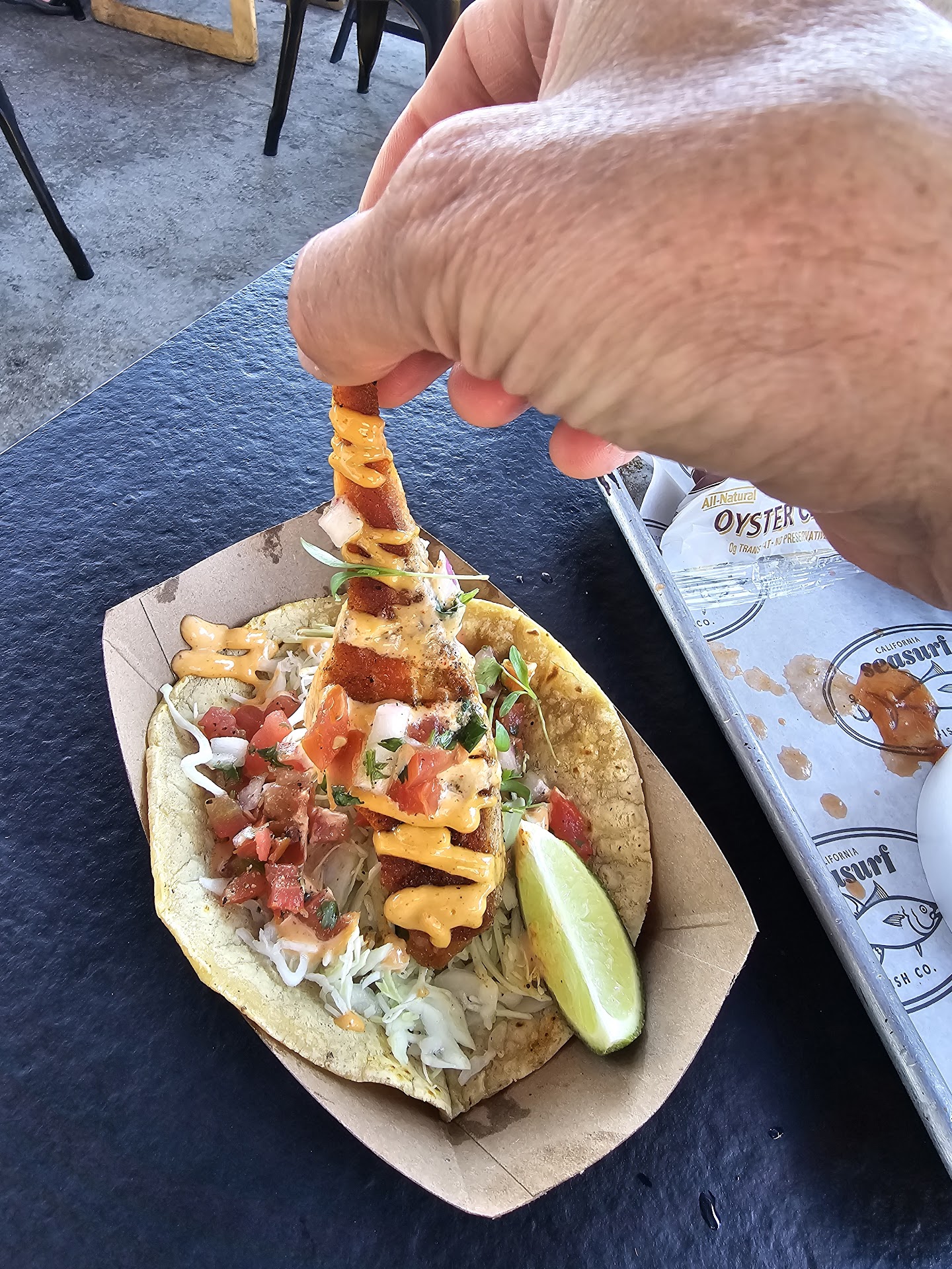 Let me start by saying we are probably spoiled by the food (portions and quality) we get consistently get at fish shop in Encinitas and PB. We are staying up in Dana Point and rode bikes to San Clemente. Although in business for over 2 years we had never seen or tried it before. We were very excited with high hopes. I got the seafood soup and a salmon taco. My wife got the salmon plate. The salmon on the taco was less than a finger in width for most of it and maybe two fingers in some parts. It was thin, overcooked and dry.