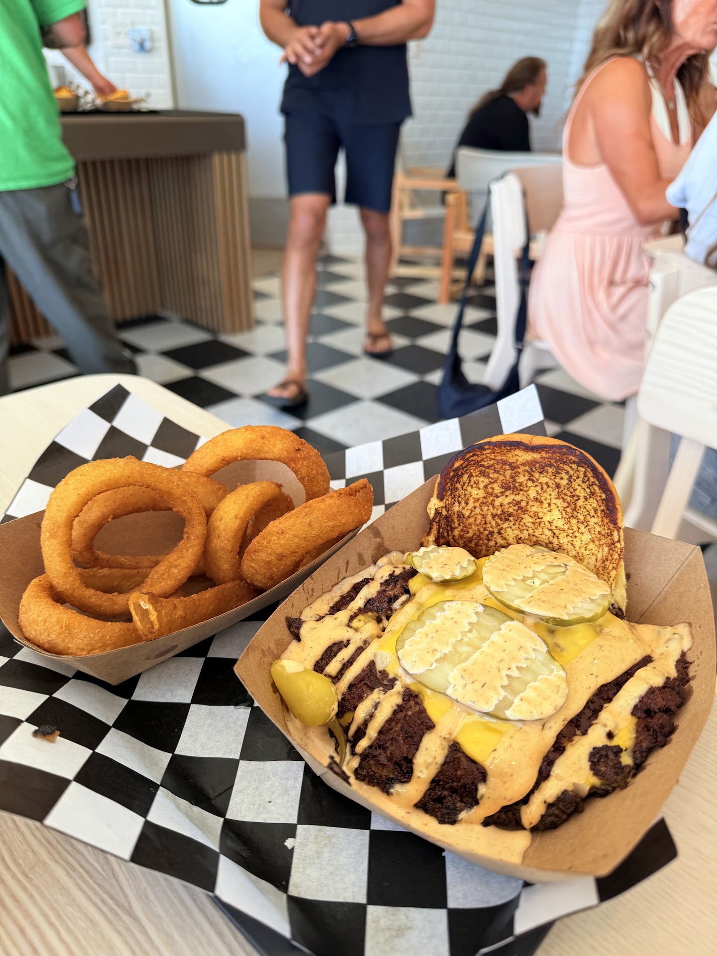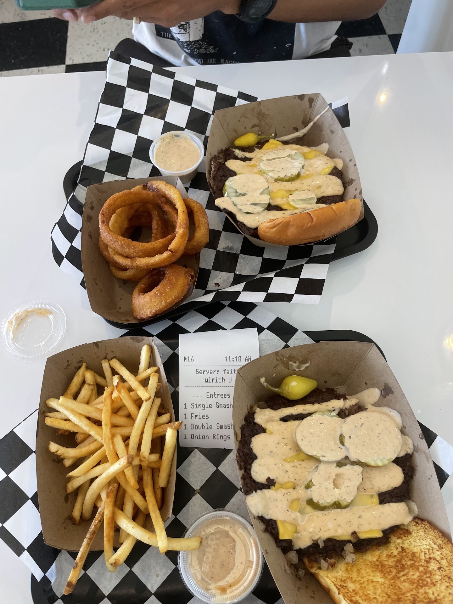 The food is honestly a little too pricey for what you get. All food is getting expensive, I get it, but if I go just down the street to Riders, I can get a thick 1/2 lb burger with lots of toppings, for $14. Here, I got one double smash burger (each smash is not very much meat), a side of fries, and a beer. With a 15% tip it was $31 for lunch. Thatās ok, but if Iām paying that for lunch, I REALLY need to love the meal or get something that I donāt get anywhere else, not a āpretty goodā burger.
