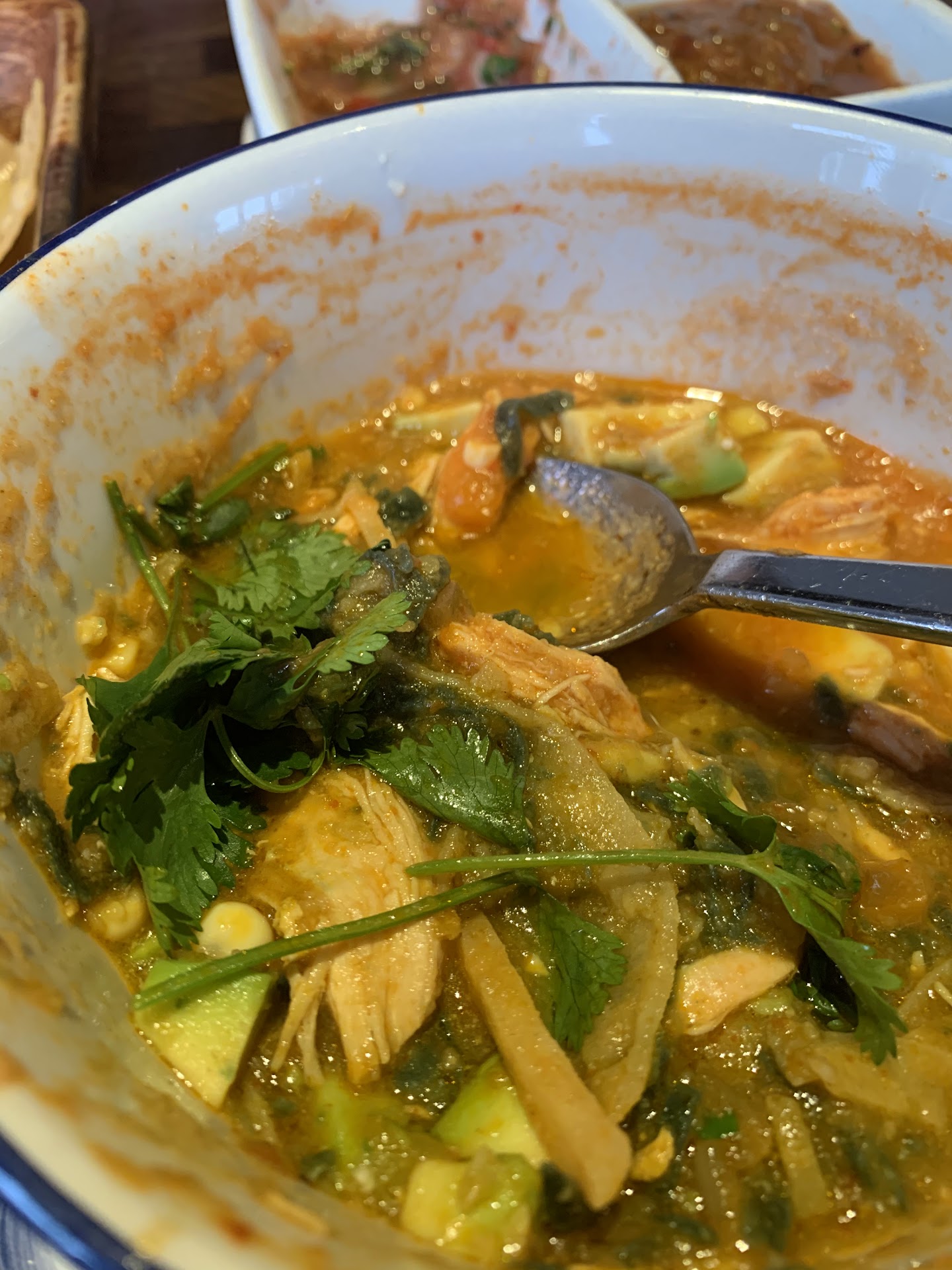 The enchilladas boast the following: chicken enchilada with mole sauce, cheese enchilada with poblano cream sauce, monterey jack cheese, sour cream, onions.