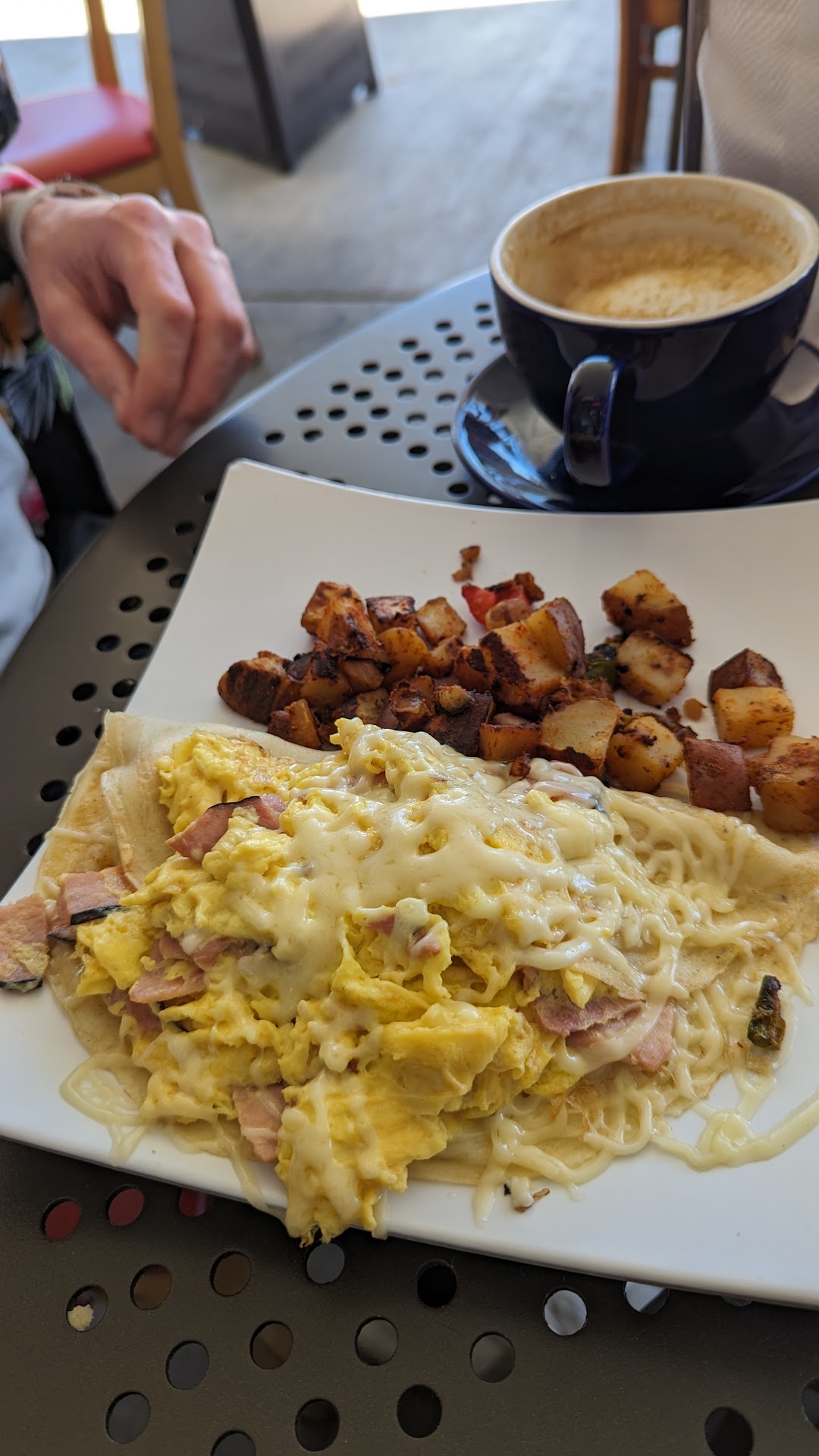 Read moreFinally had the chance to try this place and it did not disappoint! We went in on 7/4/23 very early in the morning. We called ahead to make sure it was open since it was Independence Day and luickily, it was. We ordered two cappuccinos, one double shot of espresso, two croissants, an Arely's Scramble and French toast. The croissants were not as crispy on the outside as I would’ve liked, but everything else was excellent. Our server, Kevin, was fantastic. He had a great attitude and was really on top of it; he is what anticipatory customer service looks like. Even though the cafe was quite busy, he kept our water glasses filled and even remembered that one of us preferred our water sans ice!