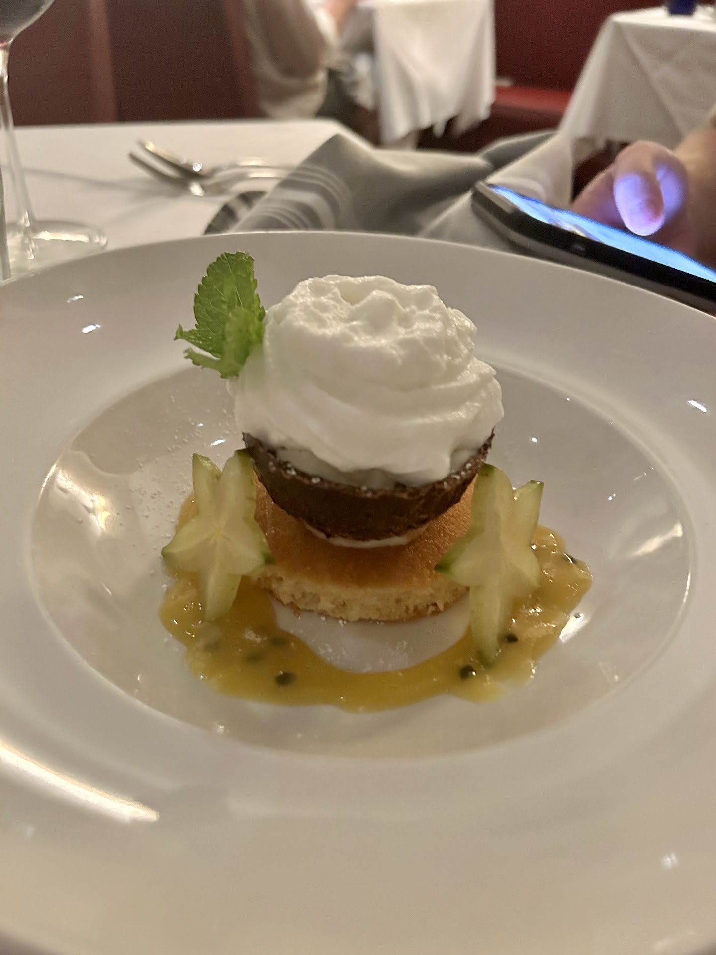 The food is just simply fantastic. The branzino is a standout, perfectly crisp potato scales and tender fillet, evoking the seaside bistros of Sainte Maxime. The scallops are seared just right, practically melting in your mouth, while the pork chop is hearty, juicy, and packed with flavor. And let’s not forget about dessert - The île flottante is one of those rare desserts that makes you want to take a moment and fully enjoy every spoonful. The texture is just right—airy yet indulgent, with a sweetness that’s perfectly balanced and not overwhelming.