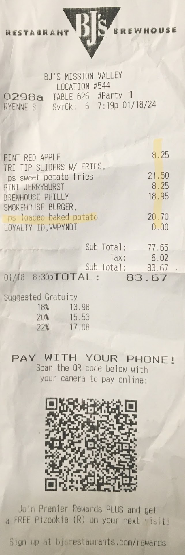 This was our first time at BJās restaurant. We hardly go out so this was a rare treat for us. Our waitress, whose name meant Snow in espanol, so I will call her Snow, displayed a peculiar & sly behavior towards us. When Snow checked my ID, she exclaimed, "Omg, you're last name is Rodriguez & youāre a Leo, no wonder I like you!" & then she glanced at my boyfriend's ID & remarked, "Oh, you're a water sign or something like that." My boyfriend just laughed it off & stated he is a Cancer. Snow followed it up with a dismissive, "Oh yeah, that doesn't matter." Thank God My boyfriend has a talent for diffusing tense situations through humor. I have worked as a waitress numerous times, it is lazy for a waiter to sit down at the dinerās table to take the order, resulting in mistakes & even the omission of our dessert at the end of the evening but we were so ready to leave by then. Despite all of this, the food was prepared, although certain elements were not executed correctly. My man received a loaded baked potato instead of the white cheddar mashed potatoes he had ordered with his burger. The kitchen simply scraped the contents of the fully loaded baked potato into a little bowl, sprinkled some bagged shredded cheese on top, & neglected to make the white cheddar mashed potatoes for him AT ALL! It was truly baffling! Idk if the kitchen was intentionally slacking off or if it was Snow. Next time, I will choose to sit at the bar! The drinks were delicious, we had the BJ's Blends Berry Blast & the Red Apple with Jeremiah Red made me fall in love. Initially, I had wanted the Black Velvet, but I changed my mind. Instead of directly informing Snow after the drinks arrived, I made the replacement through another staff member, I didn't want to give her a chance to insult my man again. However, Snow approached us & claimed that the bartender had not heard the order change properly, resulting in a delay in the drinkās delivery. Before addressing the issue, she remarked to my boyfriend, suggesting that he should have allowed me to order my food & this would've never happened. I promptly defended my boyfriend, stating that I had asked him to order for me but failed to provide clear instructions. It was weird for me to justify or defend his actions to this woman, as he had done exactly what I had asked, & it's none of her damn business! Snow's behavior was unprofessional, openly judging my boyfriend while neglecting her responsibilities. I cannot comprehend her motives or grievances, but I would never treat a customer in such a manner. Her consistent attempts to make him ālook badā were perplexing & unsettling. This behavior didn't stop us from enjoying our meal. Snow seemed fixated on my satisfaction, as everything I received was accurate & well-prepared.