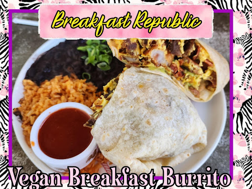 We decided on Breakfast Republic because they had quite a few vegan options, which we always appreciate ... and they all sounded rather interesting. Honestly, I don't think there could possibly have been a bad choice, so it was a matter of making the best choice .. for us. Sandi opted for the Tres Leches Pancakes because well, she's a pancakes kinda gal :). I was torn between their Vegan Breakfast Burrito with beef strips, plant based eggs, fakon, vegan cheddar, cashew cream and more .... or the Veggie Pesto Frittata, an open face omelet with various veggies and greens, plant based eggs, sweet'n'sour tomato jam and more ... and ultimately opted for the former.