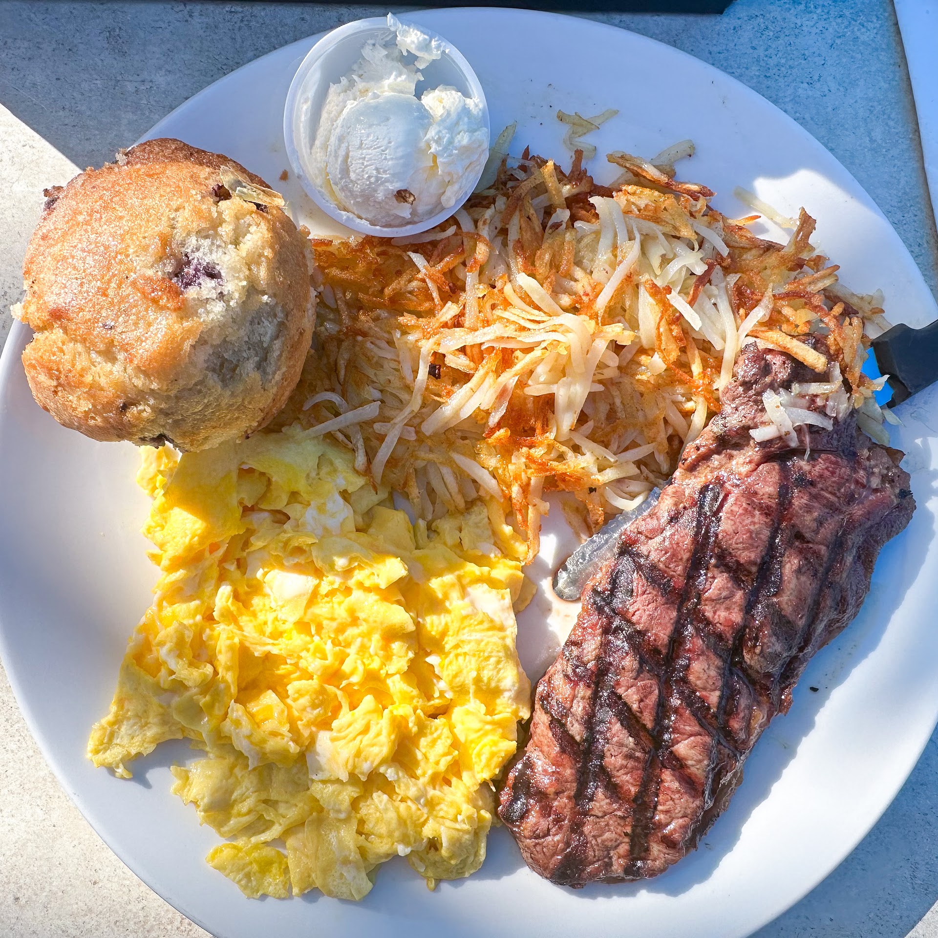 Steak and Eggs with Hashbrowns and Muffin - My medium rare steak was excellently prepared, tender, and juicy, accompanied by fluffy scrambled eggs.