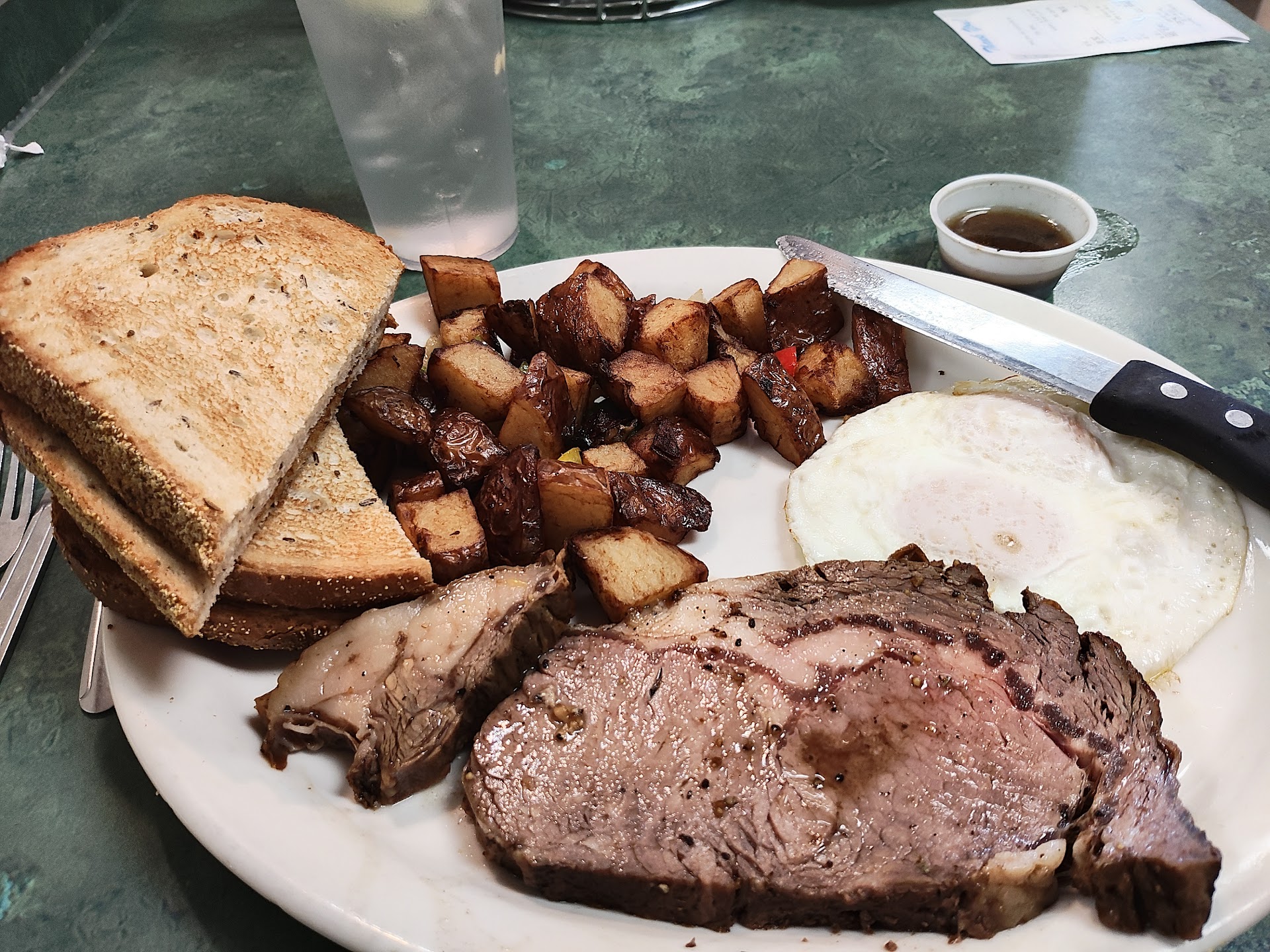 Read moreFirst time at this place and my experience was 🤷🏽♂️. If it's your first time going there, I'll advise against sitting at the bar unless the cashier or server acknowledges you. Otherwise they might think you are waiting for a to-go order. The reason behind that argument is that when you walk in the cashier is facing inside the dining room, so that person's back is facing the door. So, I spent 3 before I was asked if I was eating in or taking out and another 8-10 minutes for a server to even stop and take my order even though plenty were just in the kitchen walking or just talking in the corner with the cashier. The food is good, I do wish they had a description of the steak cut (example : oz or thickness). My steak was cooked well done when I had ordered medium well - I will say that was part of my fault but without any context of the type of cut I had to go with that option. Country potatoes were good and well seasoned, same with the eggs. Coffee was alright. Take away: