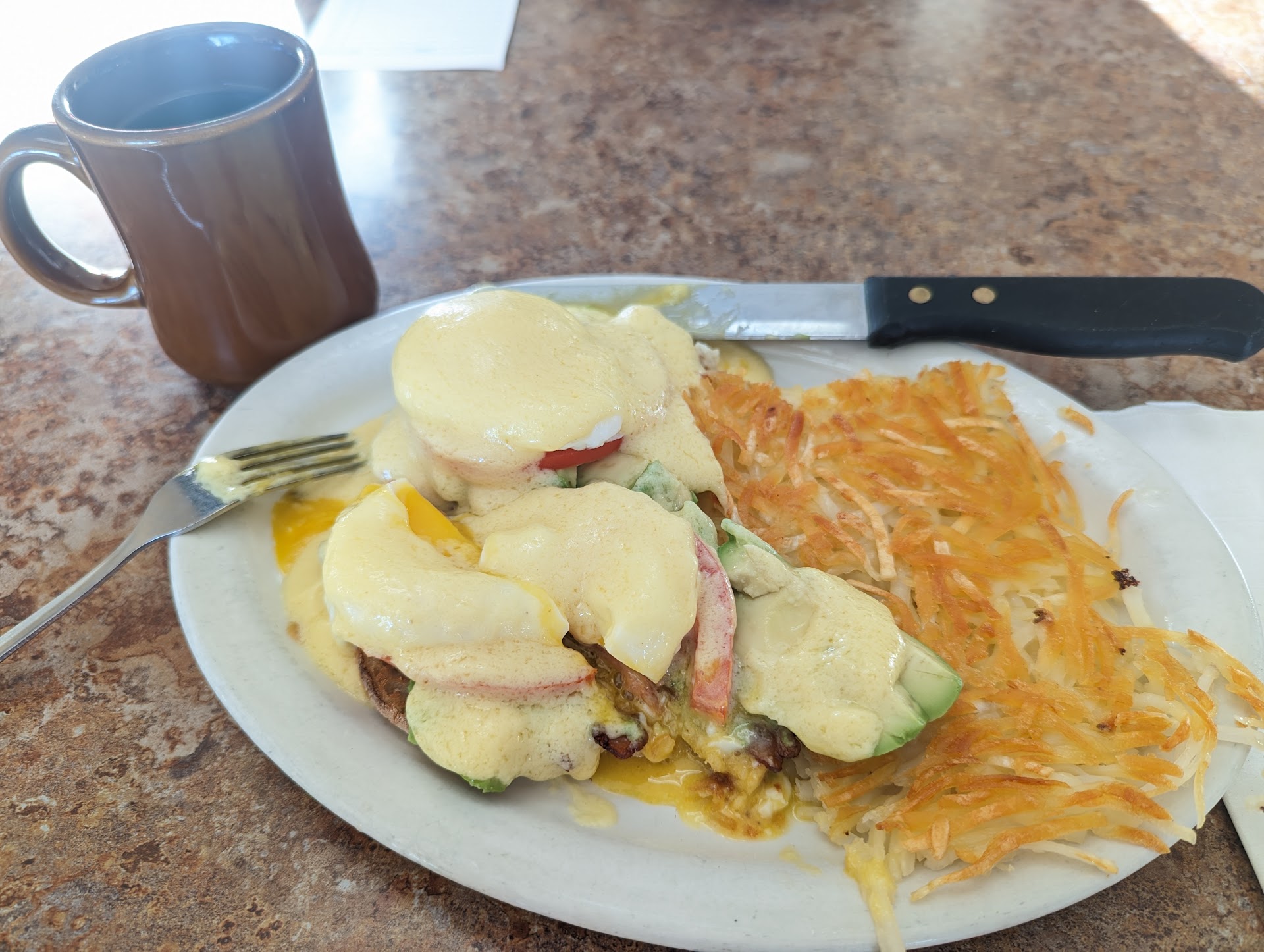 Well.... as far as the food goes, portions was enough to be full. No complaints as far as flavor and food prep. Pancakes were great, although with omelet/pancake it's $2 extra to replace toast. Usually, there's no extra charge or maybe an extra dollar most places I've been. Still, not the horrible. I did like that on my custom omelet I chose avocado and I had plenty of it!