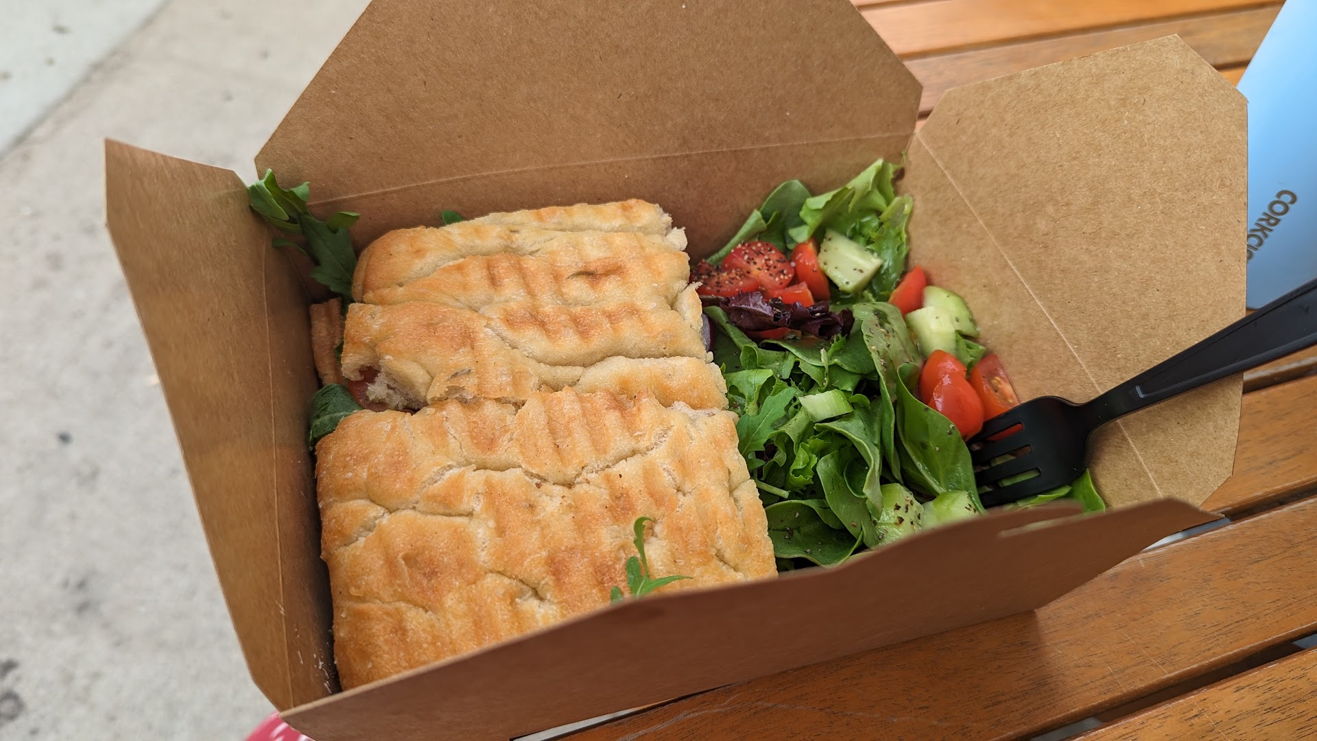 Read morePretty great place that has its vegan game down completely and it was so easy to walk from the big hotel next door. The food and coffee were amazing. I got a "shot in the dark" as well as a "chagaccino," and both were delicious. The paninis were really good, too: the focaccia bread was some of the best I've had. They also took my weird little reusable mug (Left my normal one behind and had to pivot). My only critique is please. Please use compostable plastic or alternative to plastic utensils. The to-go cups for coffee also are just purely plastic and it would be nice to have them be compostable. Both times I had brought my own utensils but I was given plastic...
