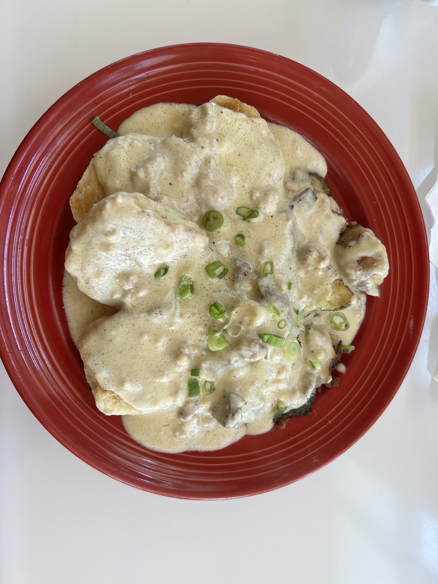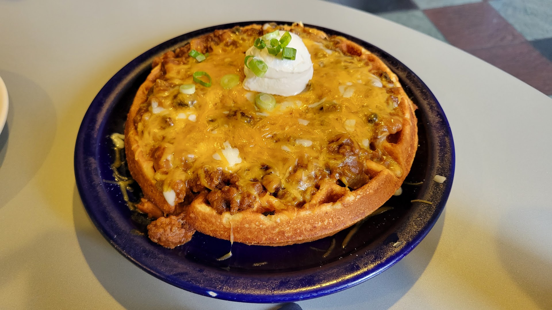 I'm giving the food 3 stars: my waffle was very tasty. The biscuits and gravy on the other hand..... THEY USED A PORK GRAVY which was not stated on the menu, or my husband wouldn't have chose it. He expected a traditional gravy. So it tasted weird with an after taste. I know because I tried it. It was MEH. You know most placed don't even put meat in the gravy to give that vegetarian option. Just throwing that out there.