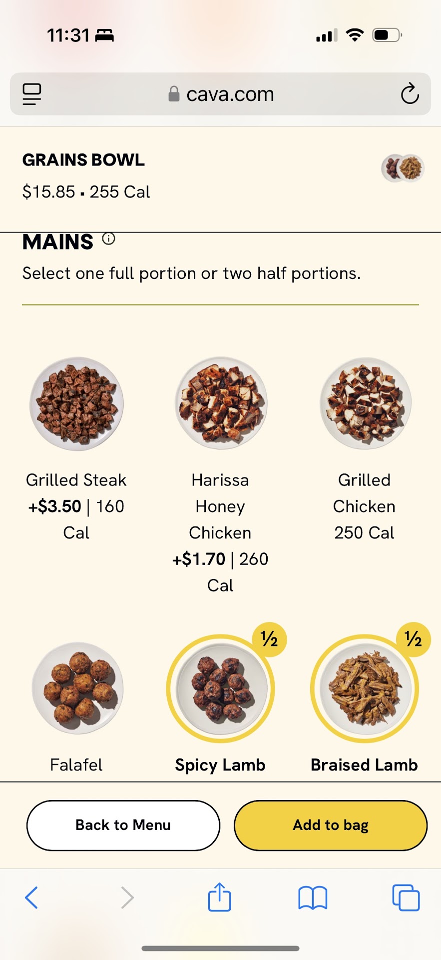 According to the TV menu, I chose the $12.05 Grains Bowl. For the protein, since the Grilled Steak was sold out, I followed the store’s instructions and selected half spicy lamb meatballs and half braised lamb. Since half the lamb meatballs cost an additional $2.50/2, and half the braised lamb cost an additional $3.80/2, the total should have been $15.85 + tax.(check the attached picture)