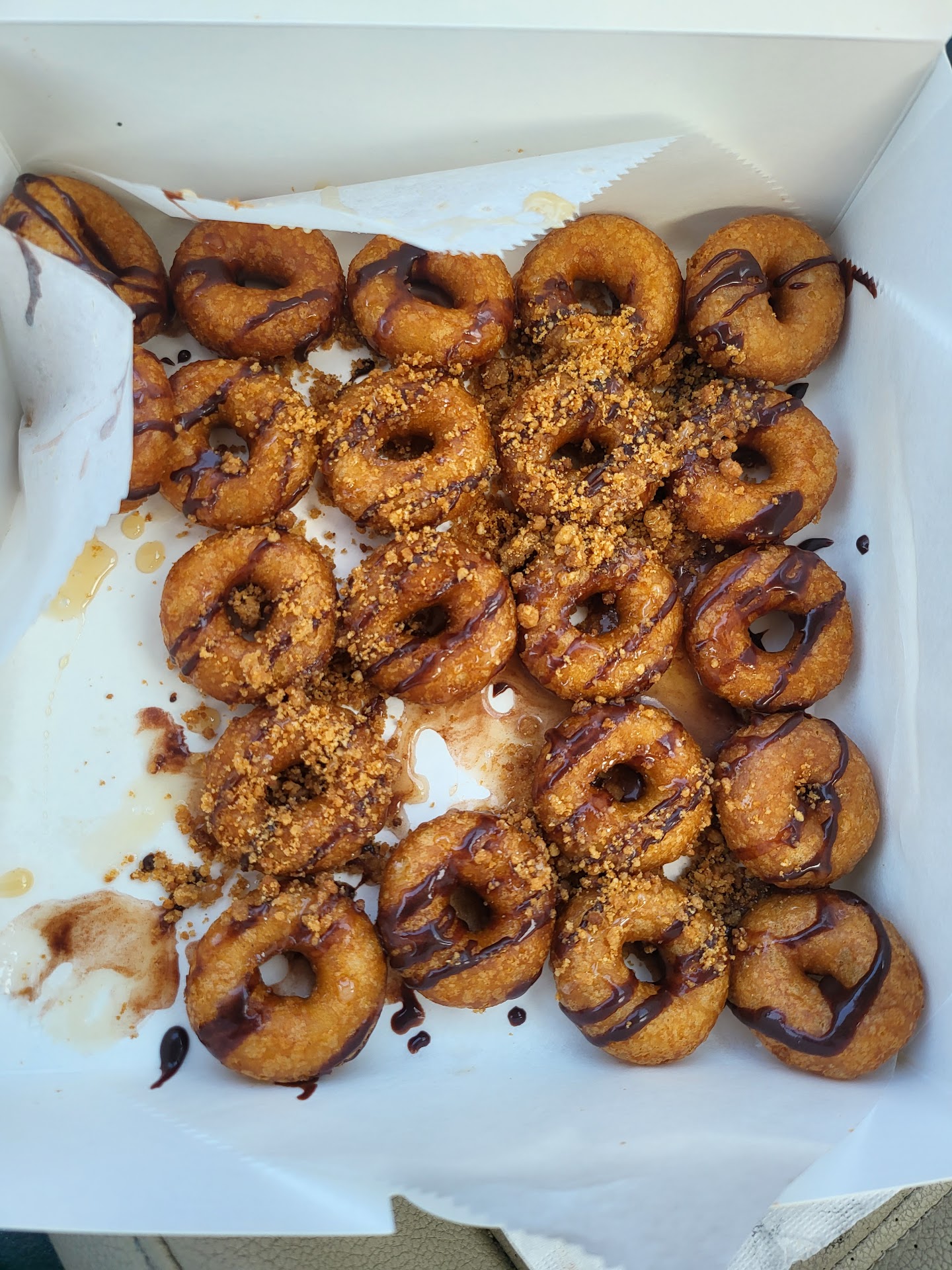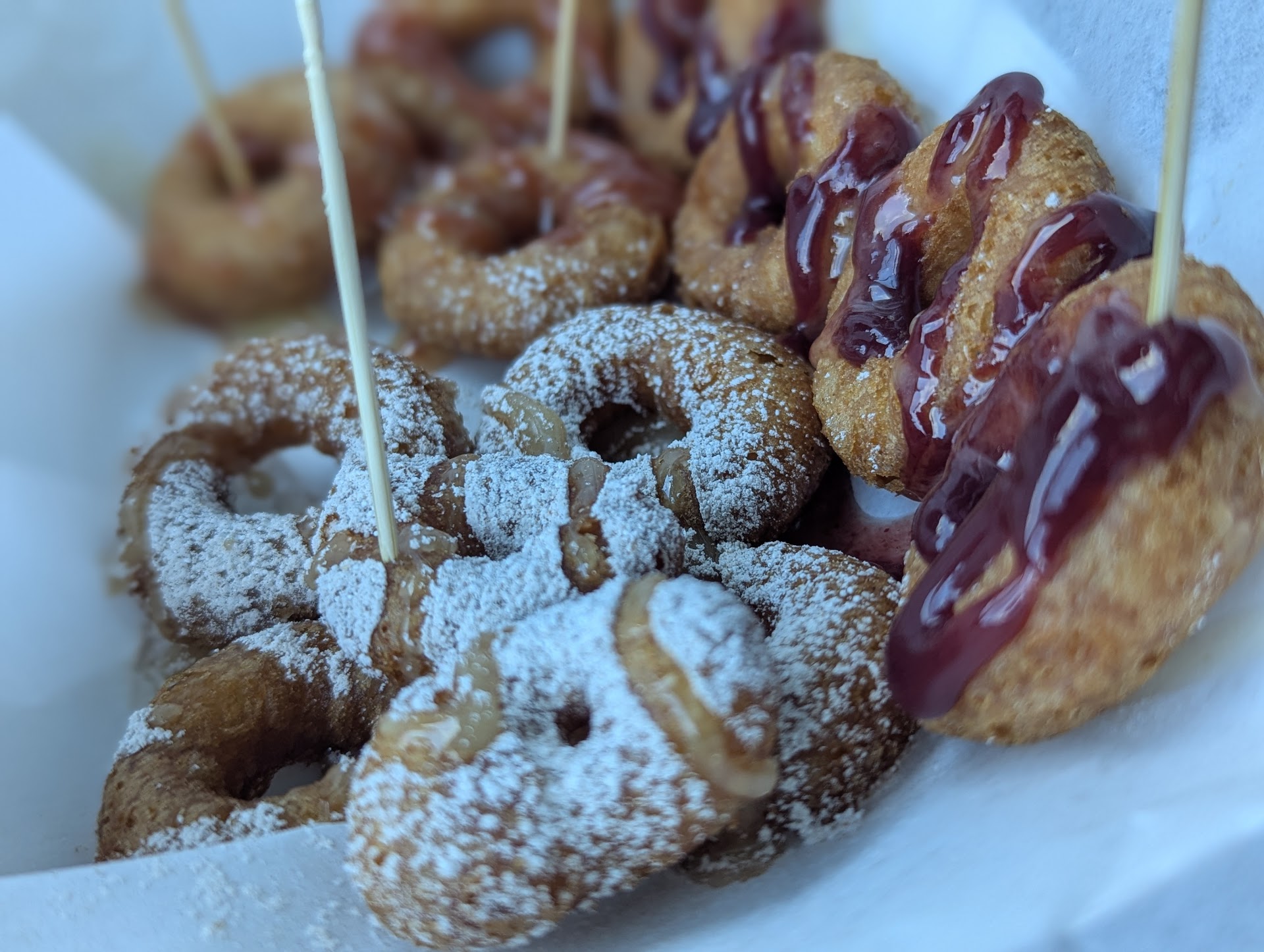 Read moreHubby and I drove down from Oceanside just to try these! So tired of the dense cake donuts they give us "gluten free " people. These are EXACTLY what you want when you think carnival donuts. Our server was a bit unfriendly or monotone but then met the owner and she's wonderful. A few critiques would be: Make these to order! Stop making ahead of time and serving them cold. WAAYYY better fresh and hot. The topping. It's just ice cream topping drizzled on the donuts. I want an actual glaze. Would be awesome if the could make them a bit bigger to allow for more flavor toppings. Also, funnel cake would be awesome!