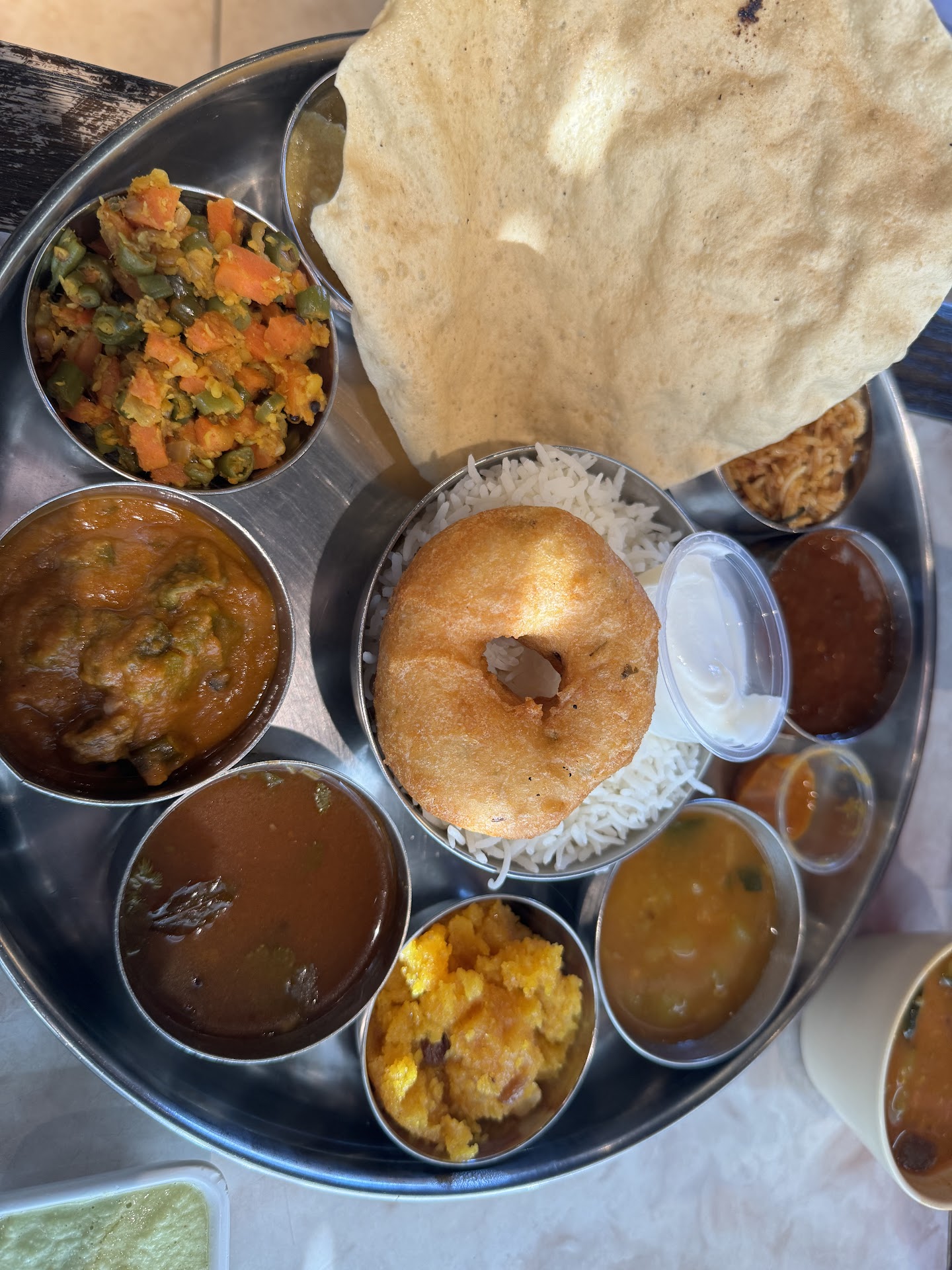Lunch Thali: 5/5 What I love about Indian food is how vast their cuisine is. I have tried Southern Indian food before, but not like this. The curries are all very rich and flavorful without being overindulgent. Coconut and peanuts take the place of dairy in the more typical types of Indian fare offered around here. The Dosa and the Vada were deliciously crispy. My favorite dish in the Thali was the Chana Masala. Chana Masala is normally in a rich tomato gravy, but here, it is deeply savory with boiled peanuts, a true treat. I am not sure how to explain the food as I am not familiar with it all, but the flavor profile is a bit more nutty and a different vibe than others, especially Northern Indian foods. The yogurt rice, this sort of sour soup, and sambar were all incredibly delicious. I am a huge fan of Indian buffets as I get to try a bit of everything, but this Thali has changed my mind and this will be one of my go to places. I am a big eater and I was stuffed after this meal! Highly recommend and please come help out a small business that has been serving the community for a while!