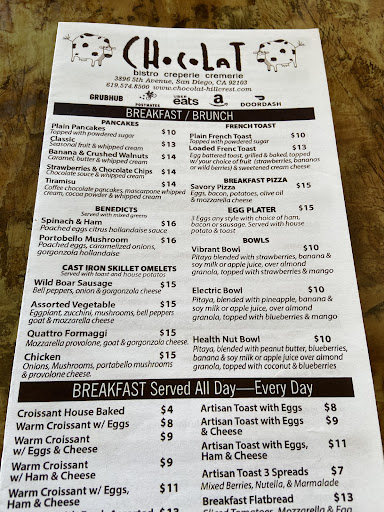 Read moreTwo days on a raw I am having breakfast at this local bistro called Chocolat. What a lovely name. And great on a spot. This is a winner. First time I have ordered crape with portobello mushrooms and Grier cheese. It was classy French size ( very large) crape done to perfection not too greasy, with the lace of the golden spots soft and crispy at the same time. Hhe quality product uses is aplaudable. Mushrooms were thinly sliced, cooked to perfecton and cheese was superb tangy and not too salty. I like a lot of sauce should ask for porchini mushroom sauce they have in stock. My almond milk cafe au late was aromatic smooth and hot with the beautiful cream painting on top. Second time today I just ordered regular coffee small pot and savory crape with veal buloniese and Beshamel ( spelling!) sauce. That one was sooo good. Meat staffed the perfect crape like velvet tomato and touch of a cream sauce remind me my time in Paris. My crape boloniese was much better !!! PWill recommend to come Thursdayâs for breakfast not too many people and the staff is super accommodating and friendly. I will come back and try little by little their famous ice cream, desert, cressaunts, eggs, cheeses, pizzas, panini soups and chocolate ravioli and whatever they have on a lovely...