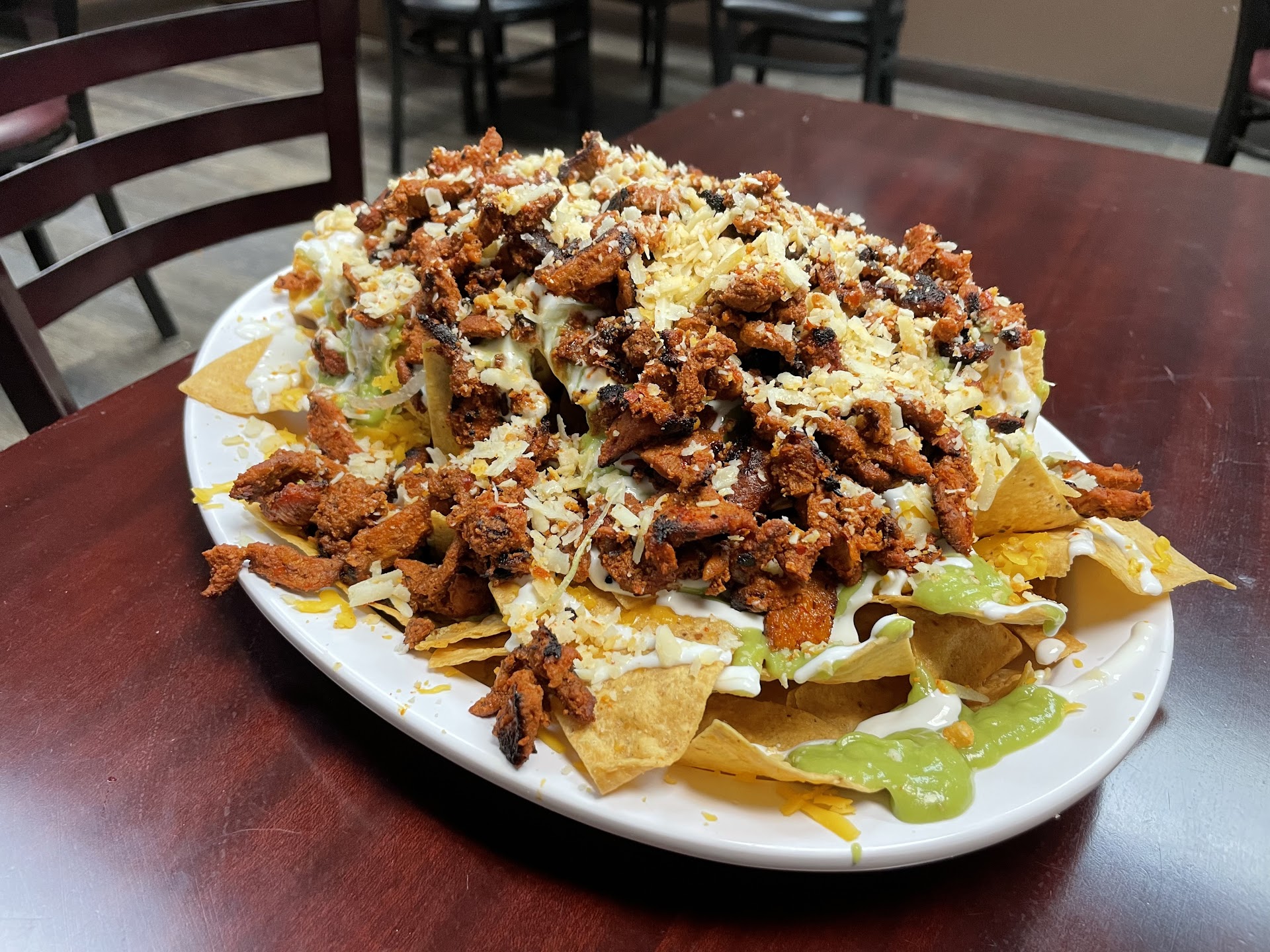 We love the size of the chips. You chose the meat and the pile of chips gets covered in cheese, Mayo, guacamole, and meat. Two types of cheese are used, cheddar and cotija. If I must put in a complaint, the chips end up being a bit too salty, and I think it’s dye to the cheese. You can cut down the salt by using salsa, still it’s a bit too much salt for my taste. The upside is that it’s never finished, tons of food for more than two people. My son and I usually share, and we cannot finish this dish.