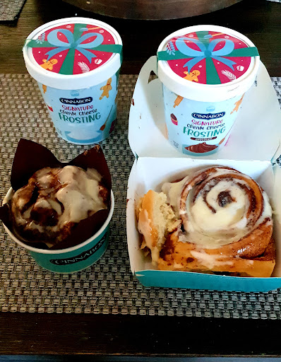 The true rating is a 3.5. I'll tell you why. When I'm eating a super dulce doughy treat, I must be complemented with ice cold milk. Room temperature milk takes away the pleasure. So I had to wait until I returned home an hour later. Also, paying extra for the icing unnerves me. Start with the right amount and don't pilfer the consumer or destroy the environment further with more plastic. Obviously, this is why we purchase a Cinnabon instead of cinnamon bread.
