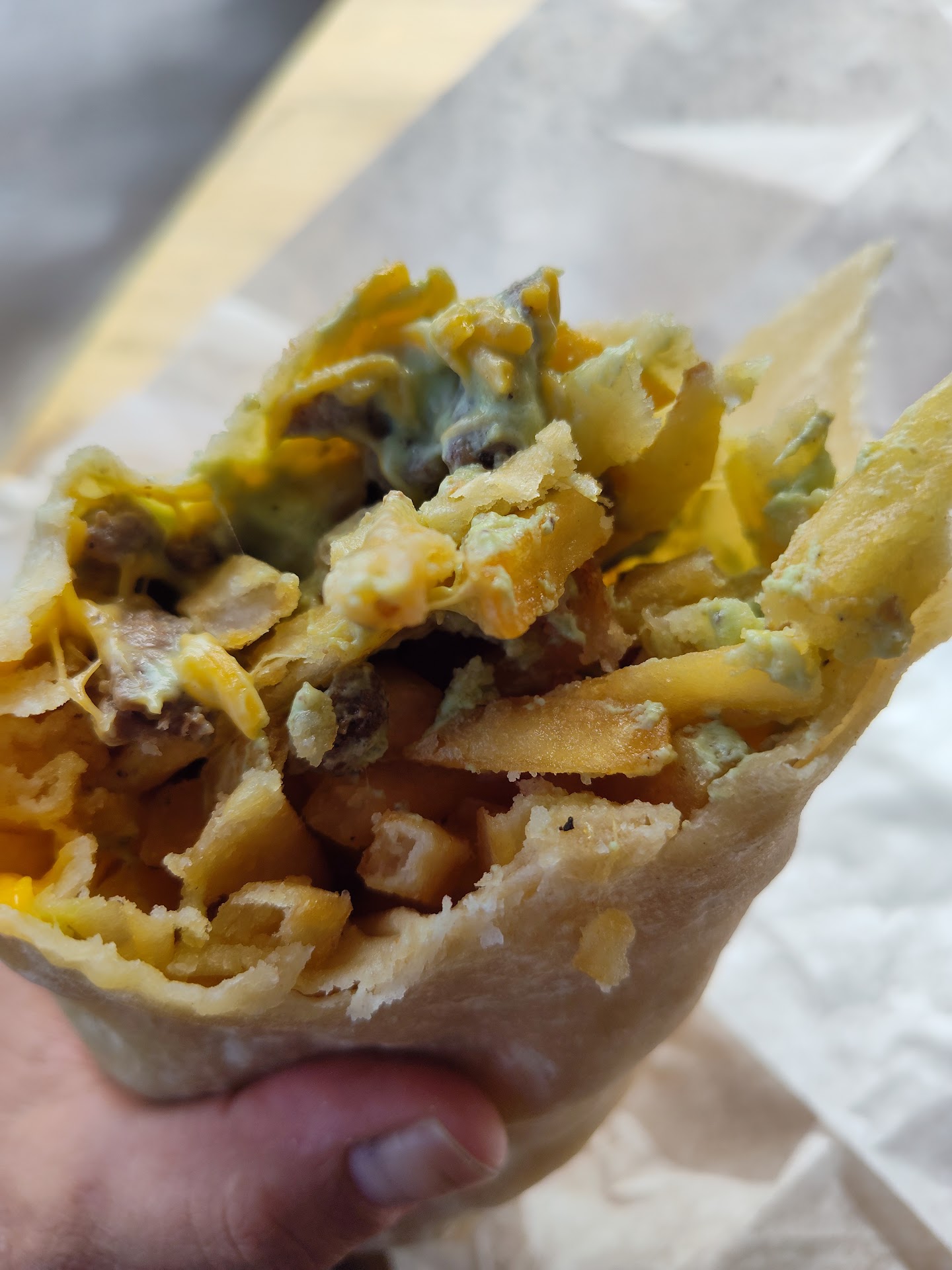 In terms of improvements, I would recommend leaving the ingredients in their distinct forms rather than mashing them together. Adding more sausage to the breakfast burrito would also enhance its taste and value.