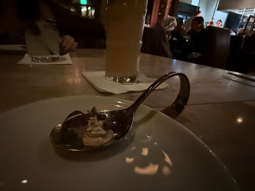 Okay, the food. The steaks were cooked and seasoned perfectly, 100% on point. My brocclini tasted like the chef forgot to count the turns on the peppermill, my wife's was bland. (Doubled up mine, forgot hers?) I like cracked pepper, so it wasn't awful, just not "Great" which is what I would expect. The tartare, which is a feature and reccomended, was out of balance and HEAVY with the garlic. Again, we like garlic so it wasn't a show stopper, but the balance wasn't there that I would expect at this price point. The french onion soup was yummy, but overly sweet. Again, it's a factor of the balance, not anything else. Finally dessert, the Peach Napolean. The execution was amazing, the pastry chef was a real artist in textures and styles, but the rasberry over-balanced the peach. Individually, great bites, but anytime you tried to combine flabors the coulis or the sorbet overpowered the peach portions.