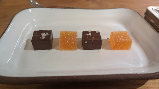 Post-dessert surprise course: Salted chocolate bownie and passionfruit gummy.