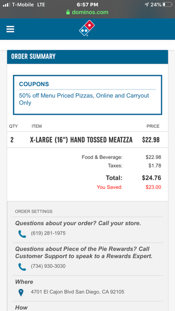 Great deals and my orders have ALWAYS been done correctly and handled with care. The staff seems to be organized, knowledgeable and whether the place is busy or not, the staff always have a good attitude. About 5 or 6 years ago, I wasn't a fan of Domino's. I didn't like the big pieces of sausage they were using and the pizza was very greasy, sometimes going through the box. That was the worst. I moved to City Heights 2 years ago and the closest pizza place was Domino's. I was too lazy to go anywhere else so Domino's it was. I ordered a pizza, picked it up and brought it home. The 1st thing I noticed right away was the pizza wasn't greasy on the bottom, no grease going thru the bottom of the box. Ok, great start. I open the lid and the pizza looked so perfect, just the commercial. The pepperoni, bacon and yes!!... even the sausage was perfect. Domino's has made amazing changes that hit a home run with me and my peeps!! I am so glad I was lazy that day because I was given a perfect pizza and each AND every order seems to be a masterpiece. Sorry Papa John's and Pizza Hut,; not only is the pizza fabulous @ Domino's, the rewards club is * No Joke*. I have received over 5 or 6 free pizzas so far. Now why would I go anywhere else, except...