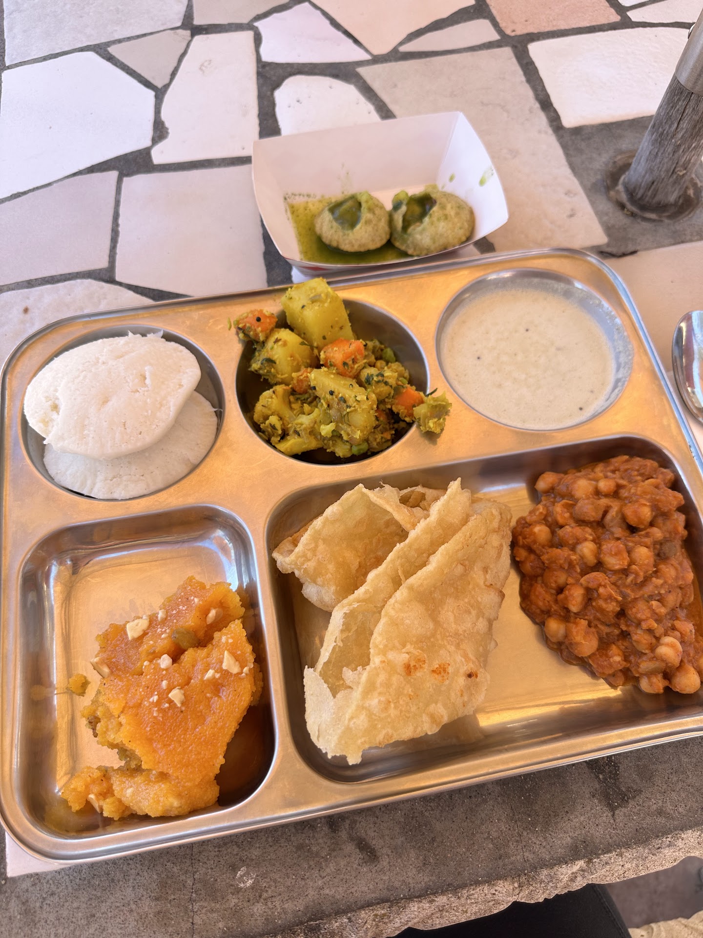 I came here for brunch today and was not disappointed. The place was packed around 11:00 AM and stayed that way the entire time I was there. You pay for your food before they seat you, and then you can help yourself to the buffet. They seem to rotate what they offer, and today they had several chutneys, sambar, dahi dosa, uppam, pulao, palak pakora, and a couple of rice dishes. I was familiar with a lot of South Indian dishes but I loved that this gave me the opportunity to try ones I haven't heard of before. They had mysore pak and rava kesari as the dessert options and I'm telling you I could have drowned myself in the kesari. The chai was piping hot and fresh, not too spicy but I definitely took a cup to go. The waiters are attentive and bring around fresh dosas often. They turn over the tables quickly as there is always a party waiting. Everything is vegetarian and I didn't miss the meat at all, all the seasoning and spice level was perfect. The puri was amazing and fresh also. Nothing at the buffet sits out or even lasts longer than five to 10 minutes. There is tons of seating inside but they also offer seating on the patio outside. Outside was quite nice and you could share tables with others if needed. They also now offer a chaat table inside which has offered pani puri and...