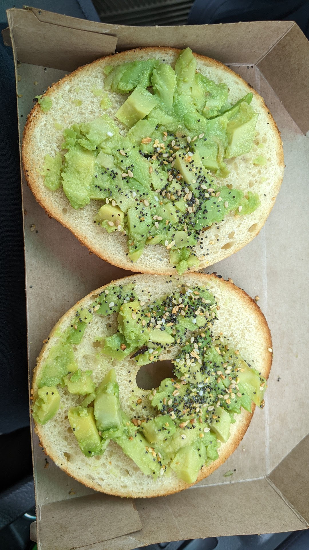 Read moreI should've heeded the previous 1-star review for avocado toast(ed) bagel...it was well-deserved. I can only imagine this dish was designed and/or prepared by someone who hates avocado and never eats it. Hands down the worst Avocado toast I've ever had. Is it frozen then thawed? That would explain the odd expression on the server's face when he handed it to me; which I understand in retrospect was a mix of embarrassment and disgust, as if to say "I wouldn't eat that but it's what you ordered so I hope you like it." When I opened the box I was initially disappointed at how few bits of avo were on the bagel but after I bit into it I was kinda thankful there wasn't more of it. It was bitter, watery, and bland. The 1-star was for the very nice toasted bagel that suffered the insult of...