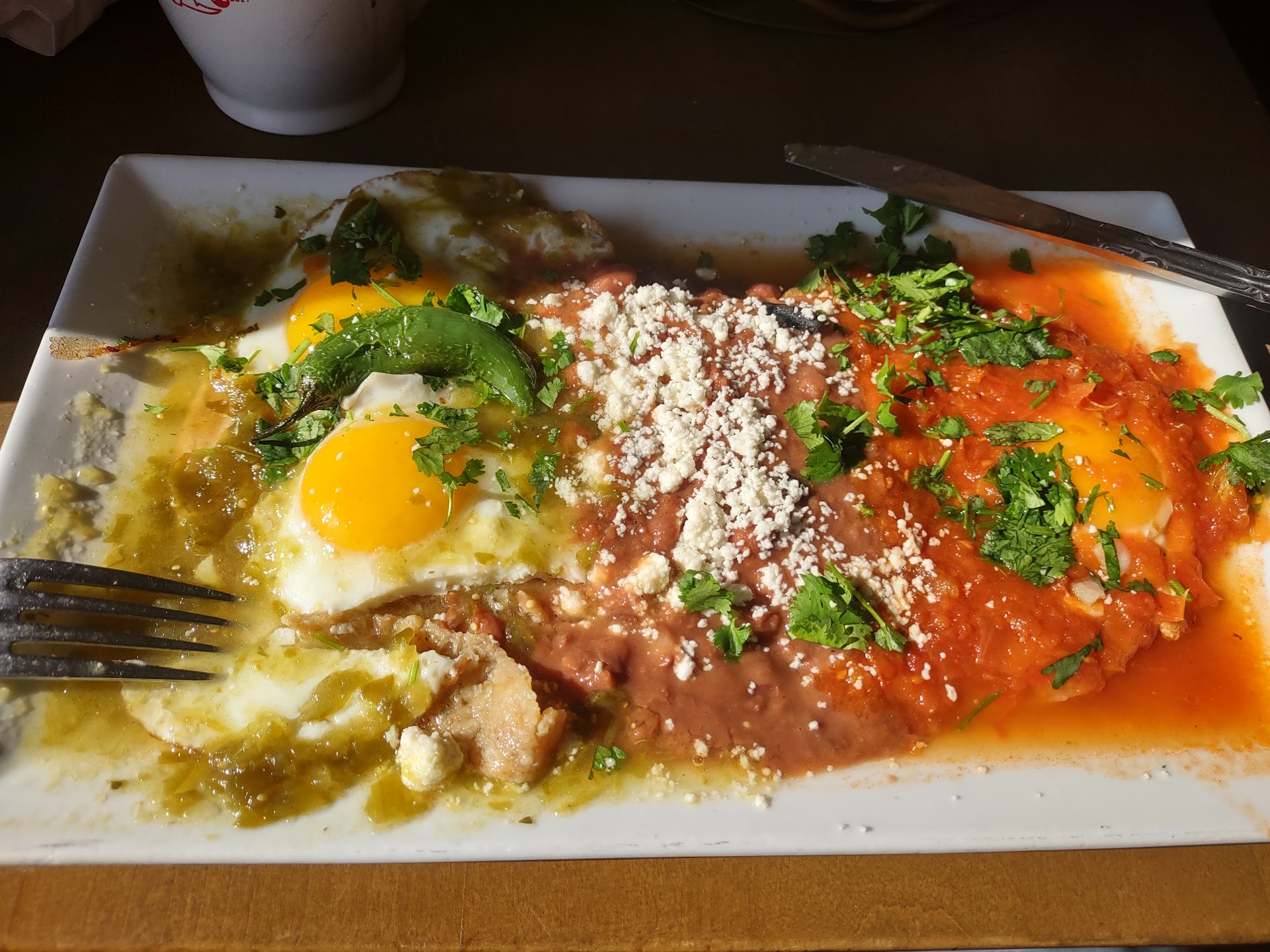 If you could only order one thing and you want to sample both of El Rincón's red and green sauces on the same plate, you should consider the "Huevos Divorciados," a plate of sunny side-up eggs paired with both salsas, each egg separated by a mound of refried beans and queso. This was a dish I ordered upon one of my early visits here, and it ensured I came back again the next day.