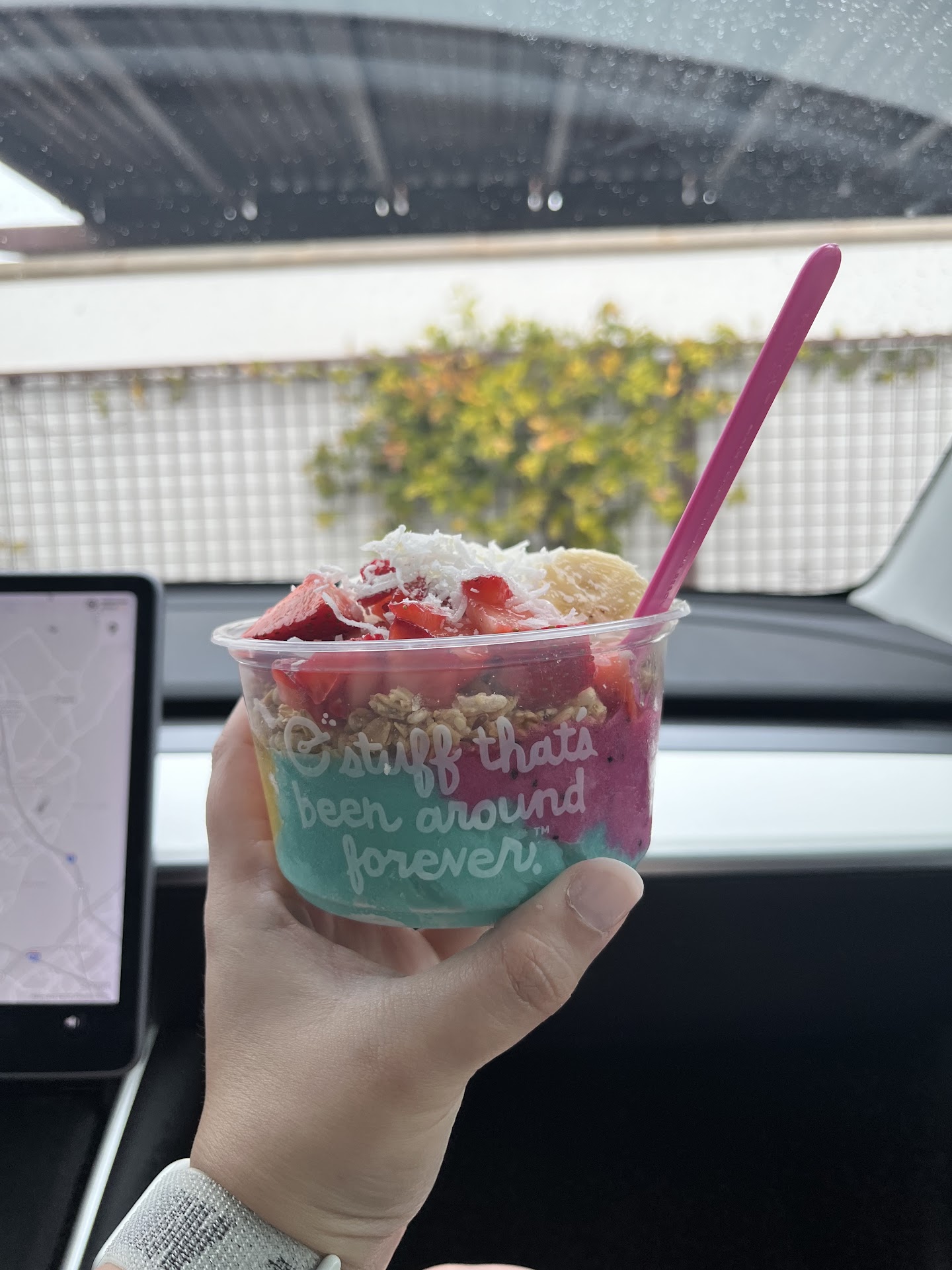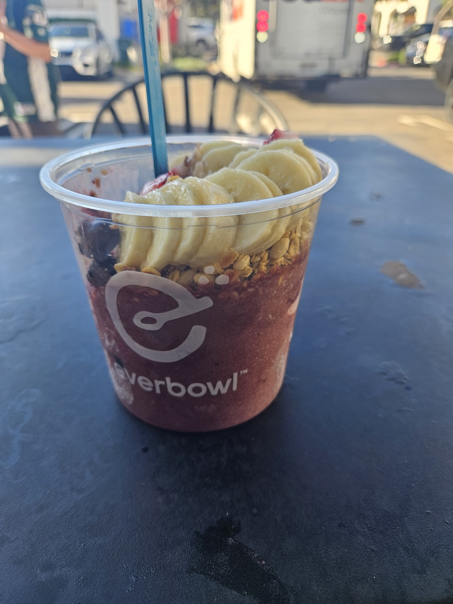 My order: medium size acai with granola, chia pudding, peanut butter, bananas, strawberries, cacao,...