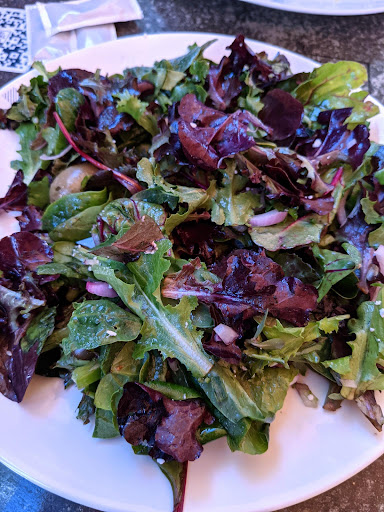 Because the Border Bowl was so sad, we ordered the Greek Salad. I mean, how could they mess that up? The photo on review is what they brought out. I guess they accepted my challenge. First off, totally the wrong greens. Most Greek salads don't even have greens. Anyway, per the menu, there should be (among other things) cucumber, black olives, feta cheese, green bell peppers, and red onion. You can see from the photo that there is some red onion, some feta cheese, and GREEN olives. They were supposed to be black olives. There were some of the other ingredients too but they were all underneath the lettuce. What's the deal with putting the greens on top of the toppings? Apparently it's a thing here. For good measure, there was a single piece of dried fig in the salad. Obviously nit supposed to be there. The taste of the salad was so bitter that it was inedible. Once again, we told the server and he just didn't seem to care. He just took the plate and didn't offer to correct the problem.