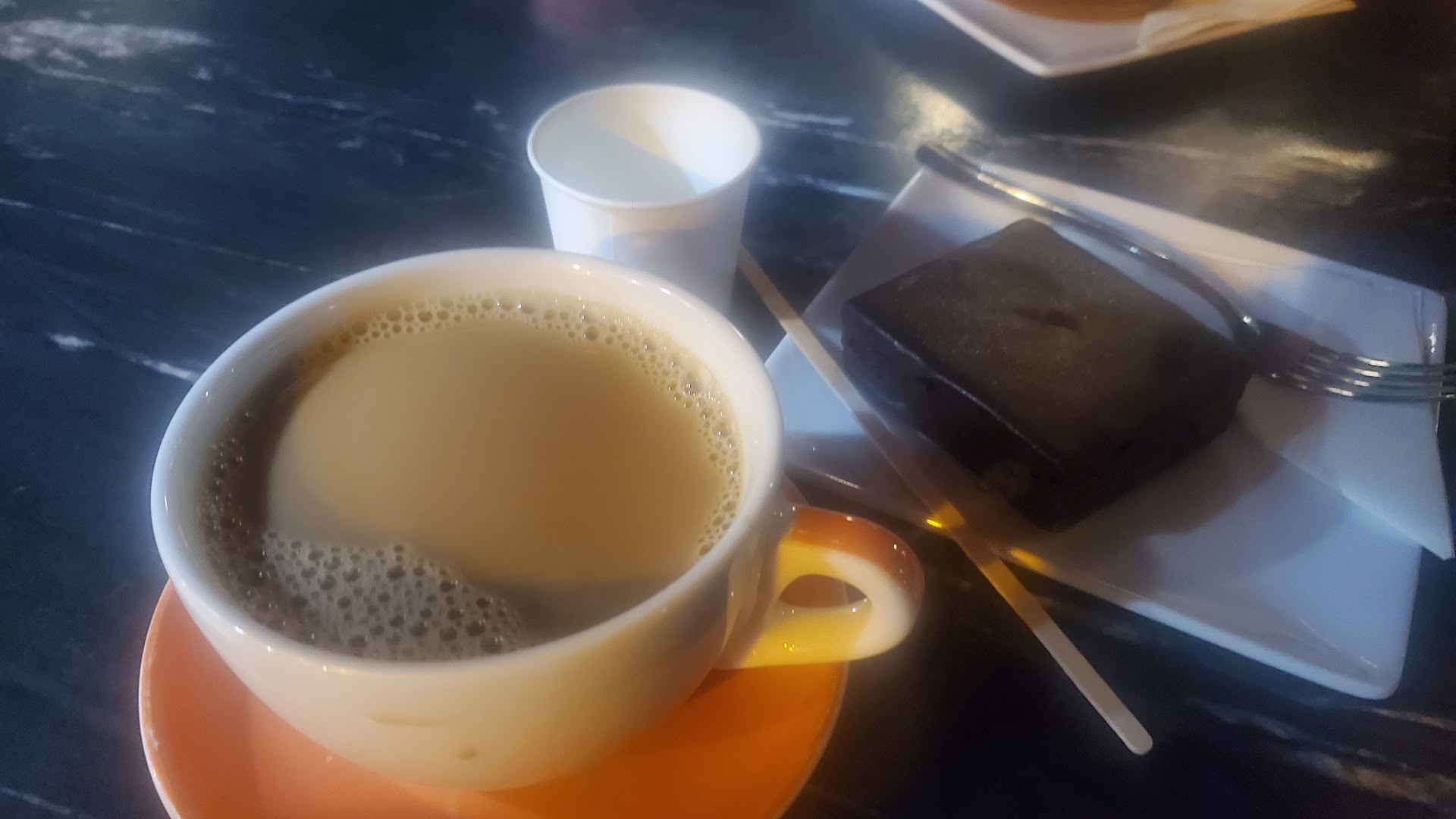 GERMAN CHOCOLATE CAKE - Three layers chocolate cake filled with pecans and coconut, topped with pecans and coconut filling. It looks like a typical slice of German chocolate cake. Sadly, no picture because it was in a to-go box and swiftly demolished. This hit the spot. You can't go wrong with a German chocolate cake, you just can't. The cake itself was a little dryer to my liking BUT with the layers of filling added good mixture to the cake. You get a bit of chocolate, pecan, and coconut filling your mouth with an even balance of flavors. Again, this would also pair well with a hot beverage. HIGHLY RECOMMEND.