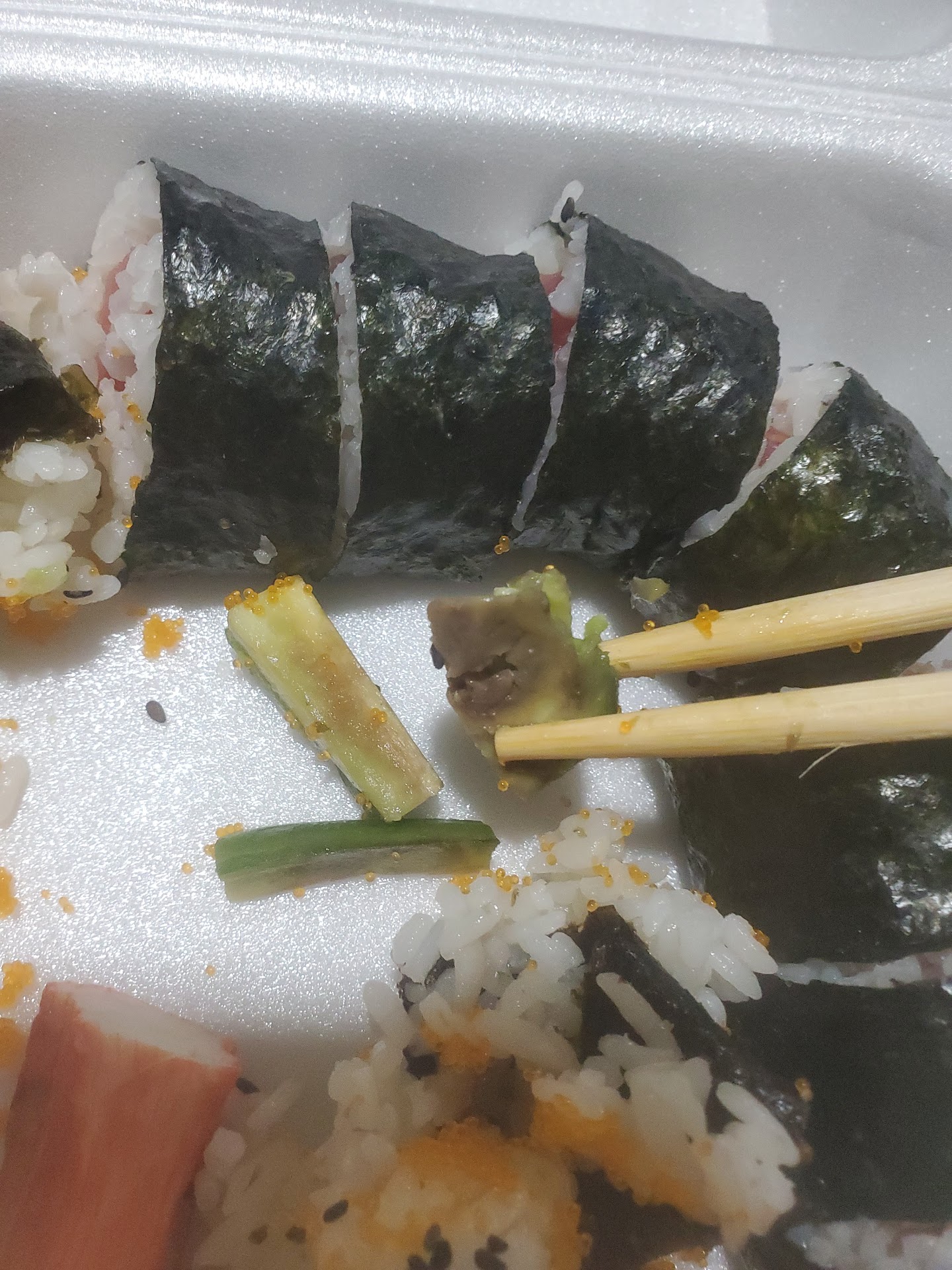 However, the overall taste, presentation, and professionalism of this restaurant is absolutely obscene. Undoubtedly the most tasteless sushi I have ever had in my life, it’s a one-man show in there, so don’t go in expecting you can get the basic essentials you would expect from a traditional sushi Resturant . No crunchy rolls, no teriyaki sauce, most things that require the use of a kitchen are not available, it’s simply a rice cooker and microwave and this gentleman‘s hands dine in is not available. It is Takeout only.