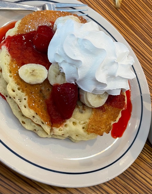 PANCAKES! PANCAKES! Love them pancakes. Had a bacon omelette which came with 3 pancakes that layed al the way to the edge of the tiny plate it came on. Why such a small plate for the pancakes? Im the type the drowns n soaks mine in syrup. That lil plate isn't going to catch the running down syrup. Back in the day they didn't have all these different options of pancakes, french toast, crapes, n waffles. The latest I think is Hawaiian roll recipe pancakes n french toast n as a bacon sandwhich? Crazy. So if ur not getting their creations like pancakes butterscotch, or chocolate, birthday cake, blueberry or strawberry, the flavored syrup options sitting on the table comes in handy. Im an old fashion syrup guy but once in a while i throw on blueberry or strawberry flavor syrup. Another thing, I say when u hire folk in a customer service based job, hire a server that has a personality n not a robot or a awkward type. Helps us consumers feel comfortable enough to want to stick around and maybe order more or an extra drink. But when all we want to do is run, even the great food isnt gonna keep a good table at its full potential. Jus sayin. I did see a server direct the greeter away from a table that looked clean but hadn't been. So least u know ur getting a clean table and great food. Have a...