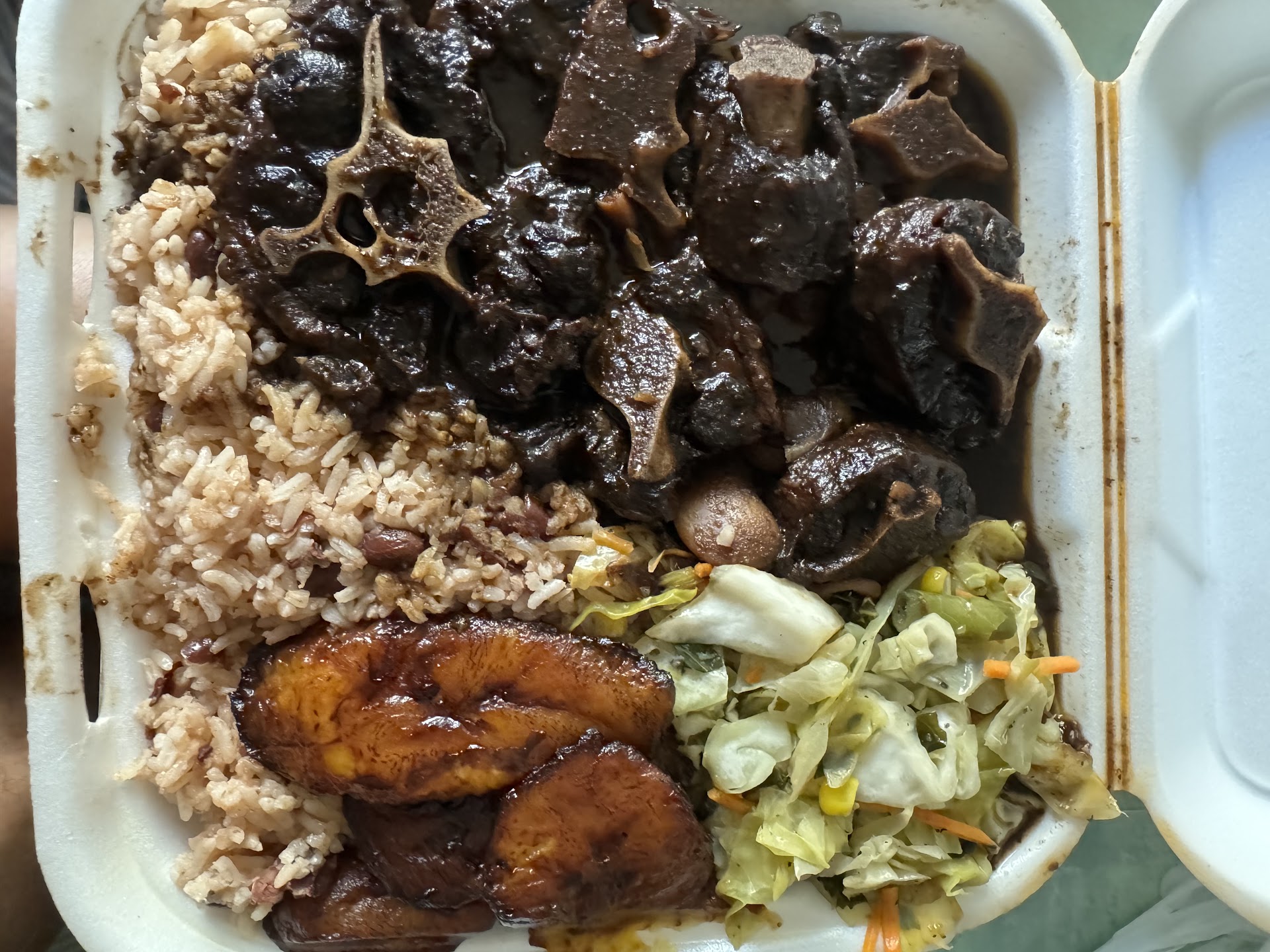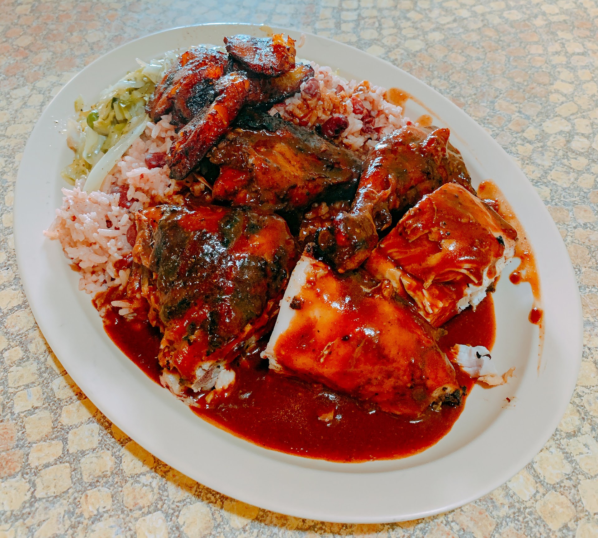 On my recent visit, I had the large "Jerk Chicken" plate, which consisted of half a chicken - breast, wing, drumstick, and thigh in addition to a large heap of rice and red beans that no single human could finish in one sitting, a generous portion of savory sautéed cabbage mixed with onions and peas, and golden fried plantains of the like I haven't had since my last Caribbean vacation.