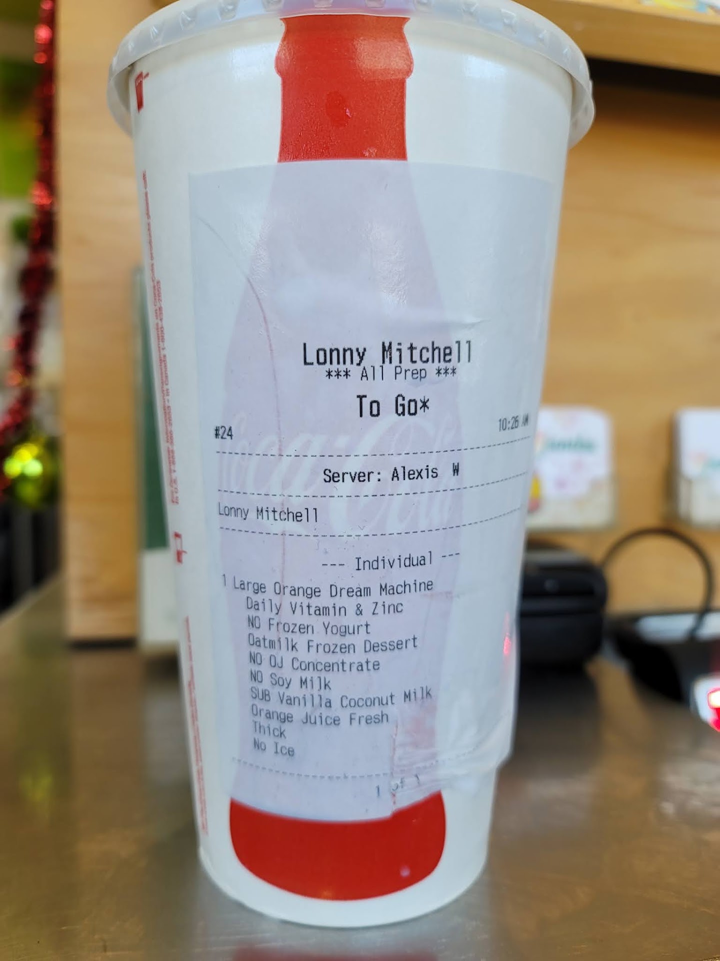 I placed my normal order for a large Orange Dream Machine. The order was placed with specific details as shown on the picture attached. The order was taken by the on site Manager Star Martinez, she acknowledged and reviewed the order with me, the order was then prepared by another staff member.