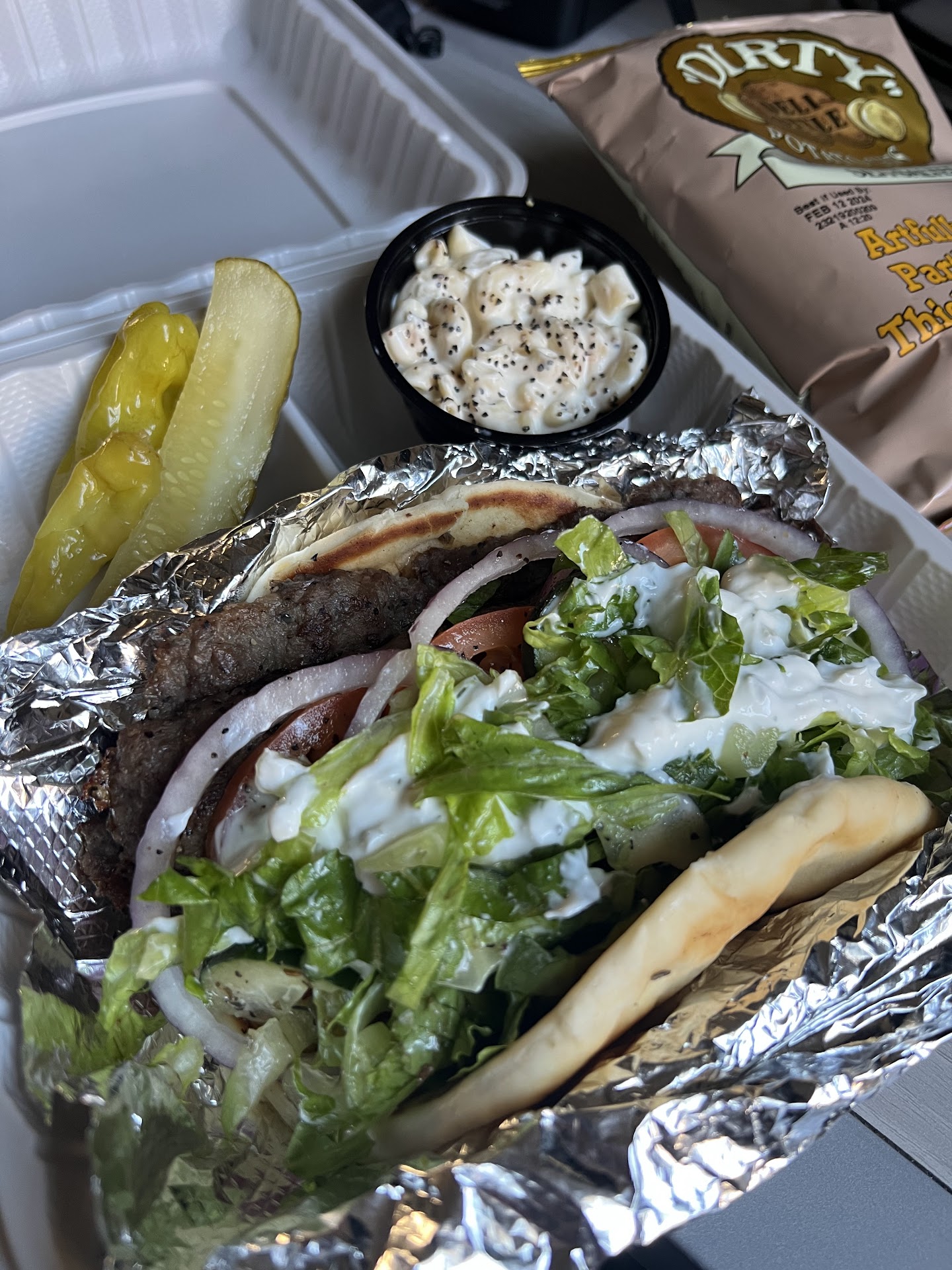 The food: my sandwich had virtually no meat on it. Bread was doughy af, not baked all the way. All of them had heaps of mayo or ranch slopped all over them. Everyone hated them. Tasteless mac and potato salads were in plastic ramekins but clearly sourced from some big cheap mass produced tub. Coworker hated his greek salad, said it was wilted and the gyro meat was old. Didnāt bother eating much and threw it out.