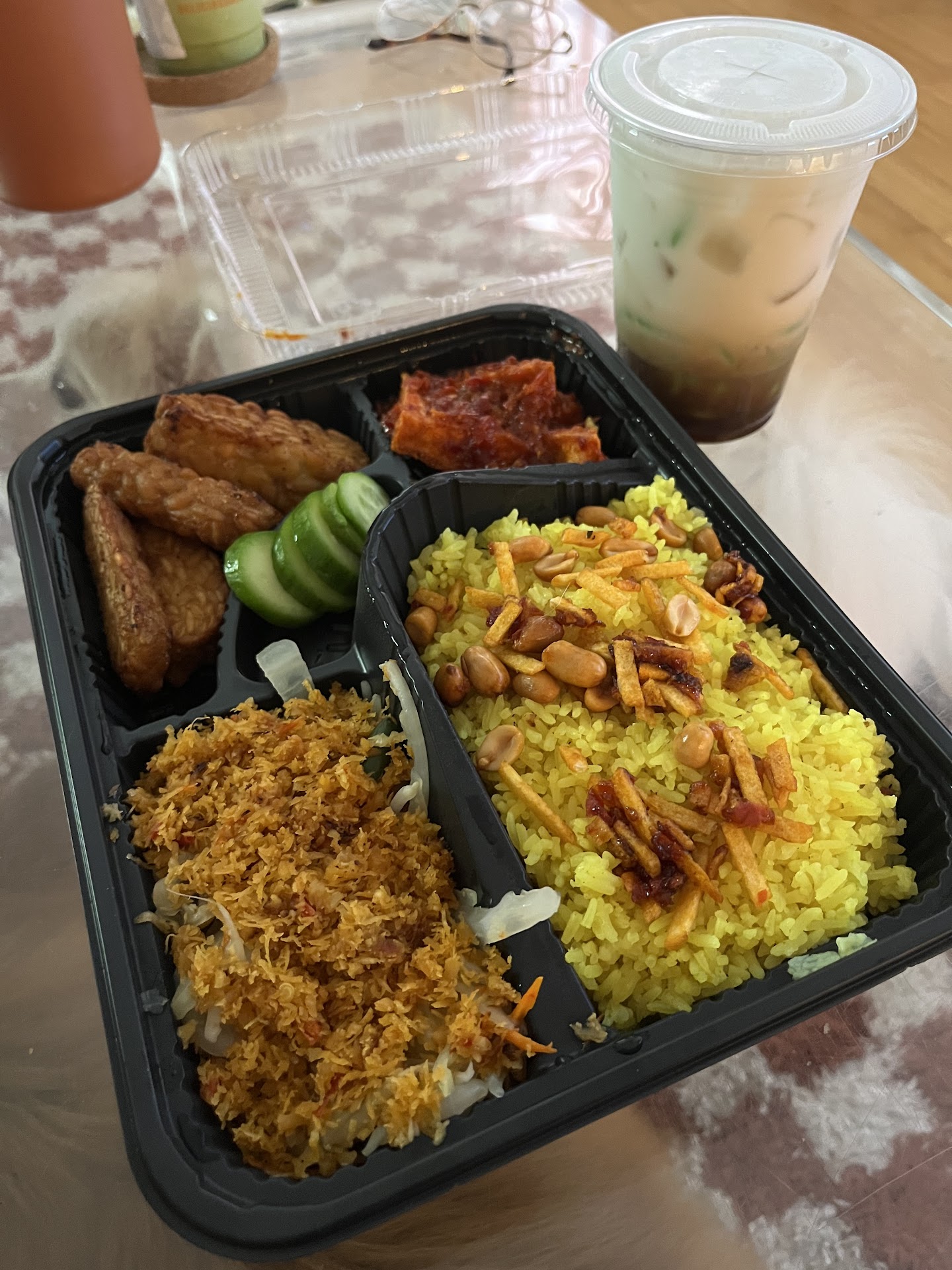 We tried the nasi kuning combo which was a really good size. They ran out of mushroom rendang and substituted it with tempeh. It was delicious (and a bit spicy). My partner grew up always getting es cendol and he really enjoyed Lezatâs - great price too.