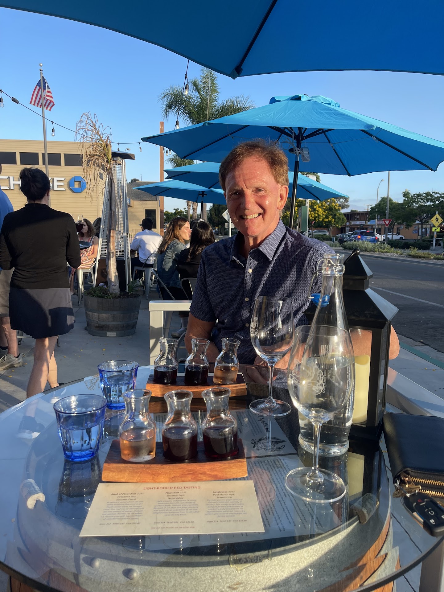 Came here with my girlfriend on a Sunday evening for a quick tasting while we were in the neighborhood. Sat outside and ordered a flight each. Gave our California drivers licenses to the server Bianca. She bent and stared at my ID for about a minute and asked me if my eye color changed...I have blue eyes, my ID says blue. Did the same thing to my girlfriend. This threw me off, but my girlfriend convinced me to let it go and to not let it ruin our time.